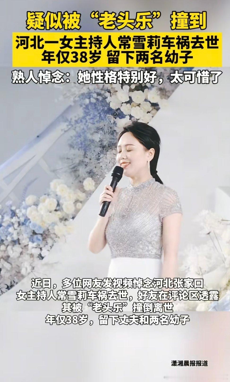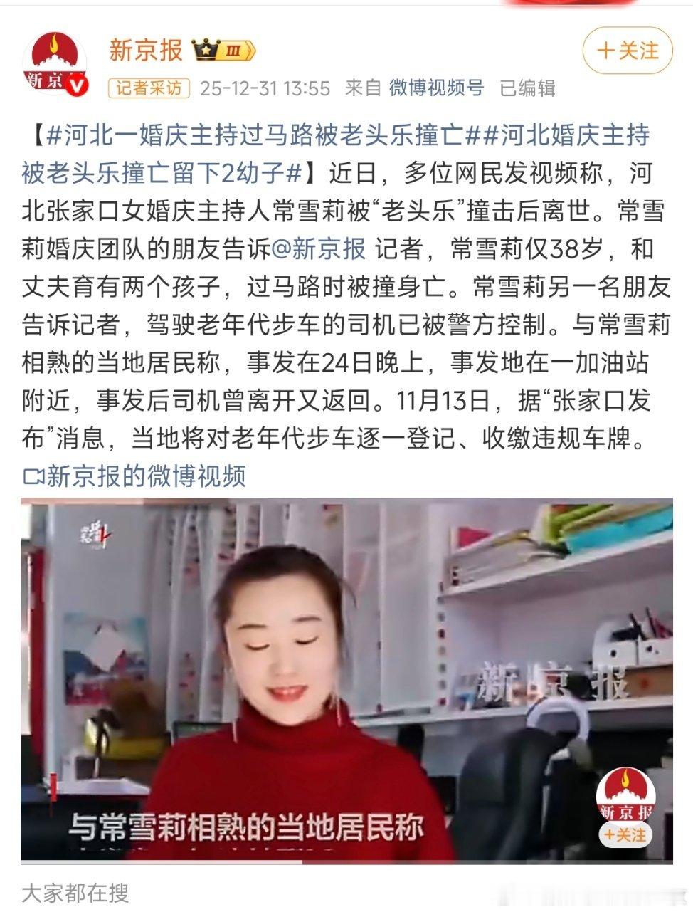 河北张家口38岁的婚礼主持人常雪莉在步行回家途中被一辆无牌无证的老年代步车(俗称“老头乐”)撞倒身亡,留下两名年幼孩子和悲痛的丈夫,这一悲剧引发公众对“老头乐”安全乱象的强烈声讨与监管反思。