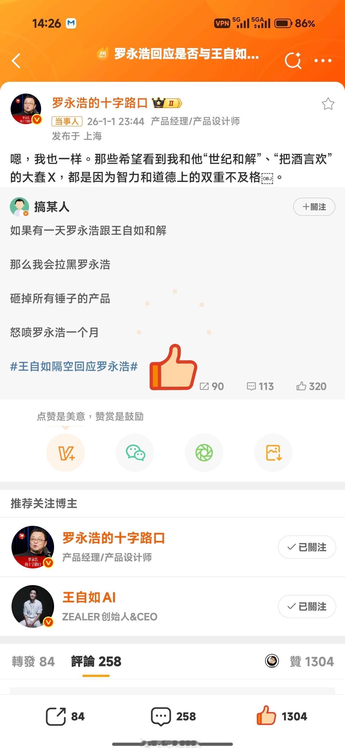 罗永浩回应是否与王自如和解看到这我就放心了,和解是不可能和解的