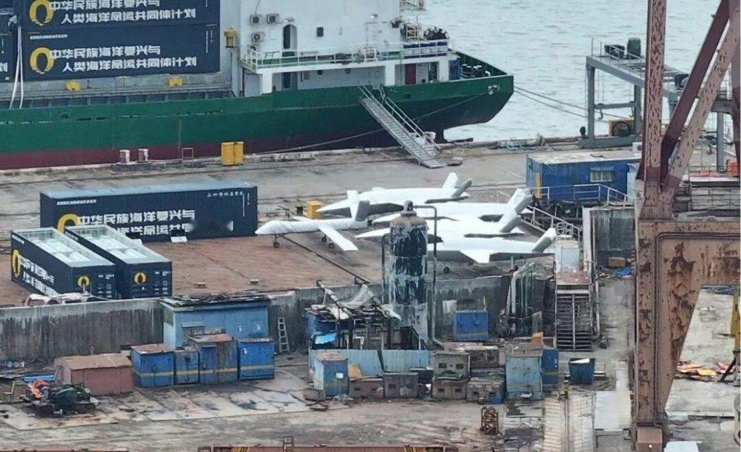 几张我们轻型航母战列舰的近景照片,照片显示部分垂直发射系统(VLS)集装箱已被拆除,移动式电磁弹射器(EMALS)已安装到舰上。 我们可以看到码头边停放着FH-97/A无人机和翼龙无人机,这意味着弹射器可以发射不同的重型攻击无人机。这是人民(无人机)海上战争理论的体现。 美国海军用于监视可疑民用船只的每一项情报、监视和侦察 (ISR) 资源,都是没有用于海军常规装备的 ISR 资源。在激烈的海上战争中,美国海军有限的舰艇很容易被饱和式彻底淹没,隐形无人机、隐形战斗机和高超音速导弹四处飞行,攻击一切目标。