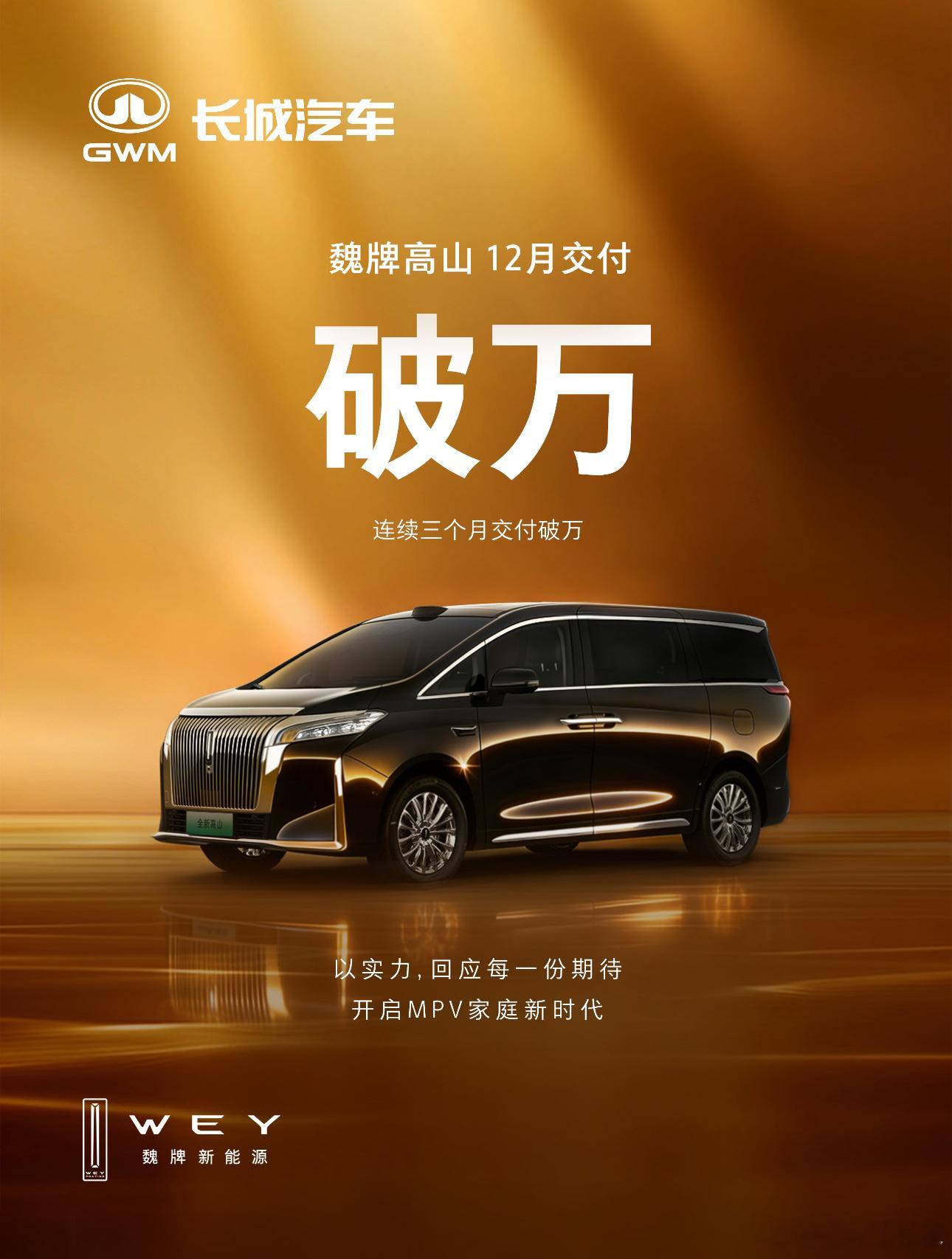 长城魏牌 25 年销量突破 10 万台,12 月份魏牌的销量为 12,899 台,这当中魏牌高山MPV占比大多数,所以目前整体均价还是比较高的,接下来还会进入到大型SUV市场,到时销量和均价也会进一步提高。魏牌高山新能源汽车