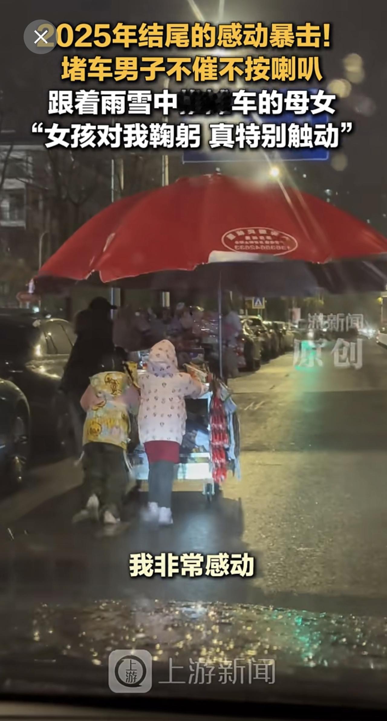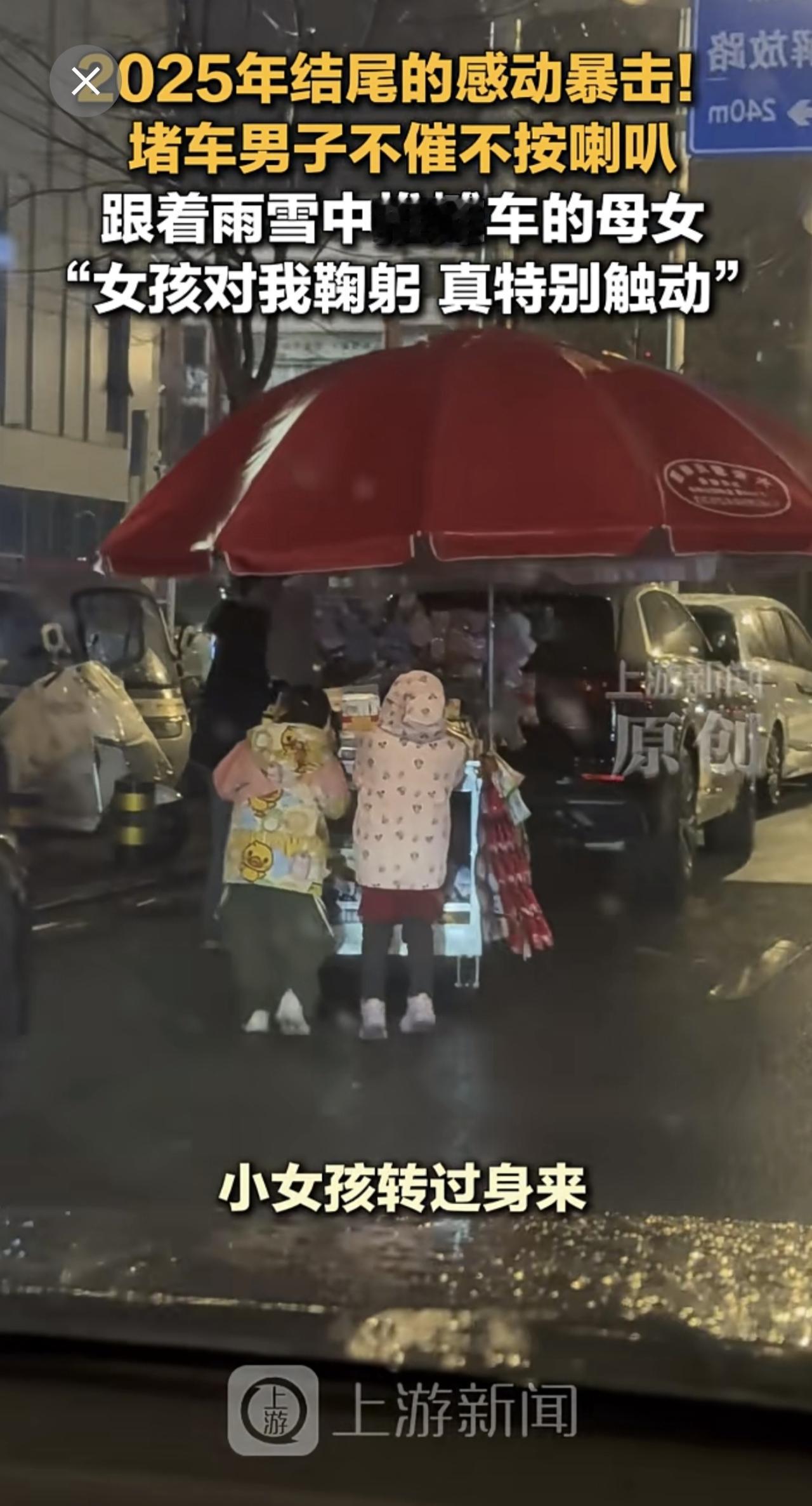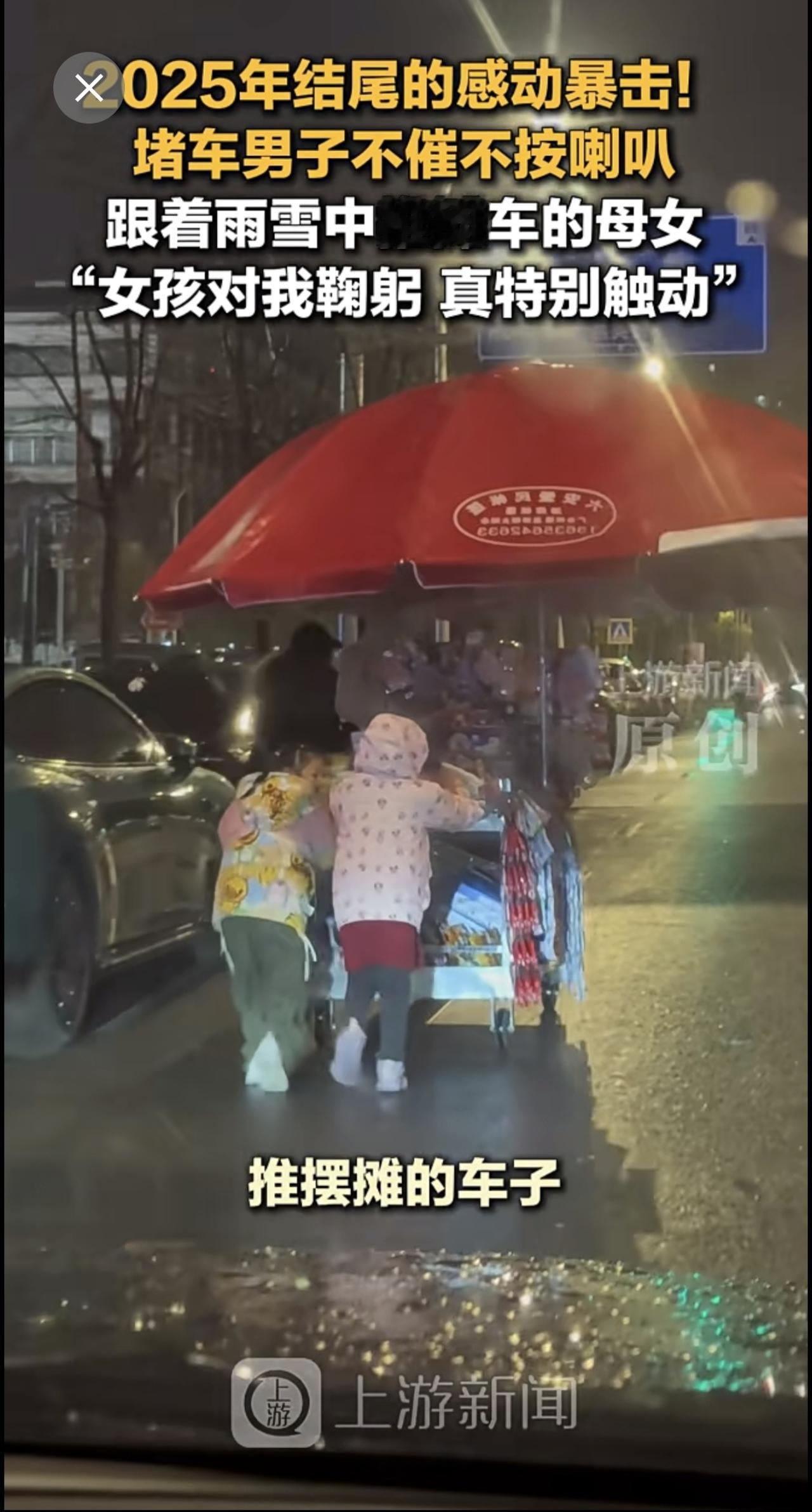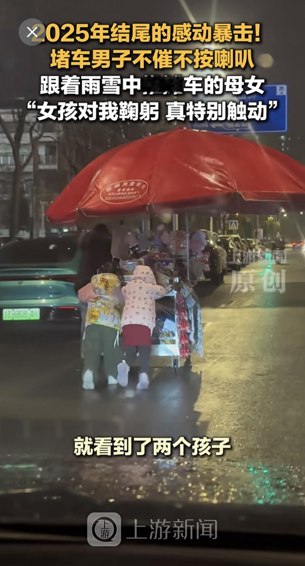 1月2日(发布),2025年结尾的感动暴击!堵车男子不催不按喇叭,跟着雨雪中推摊车的母女,“女孩对我鞠躬 真特别触动”
