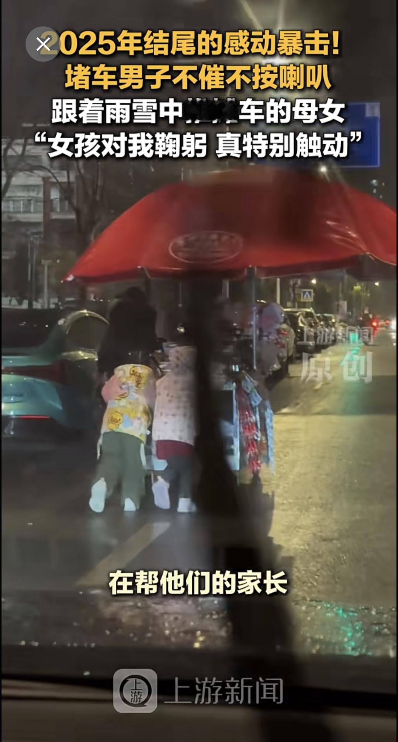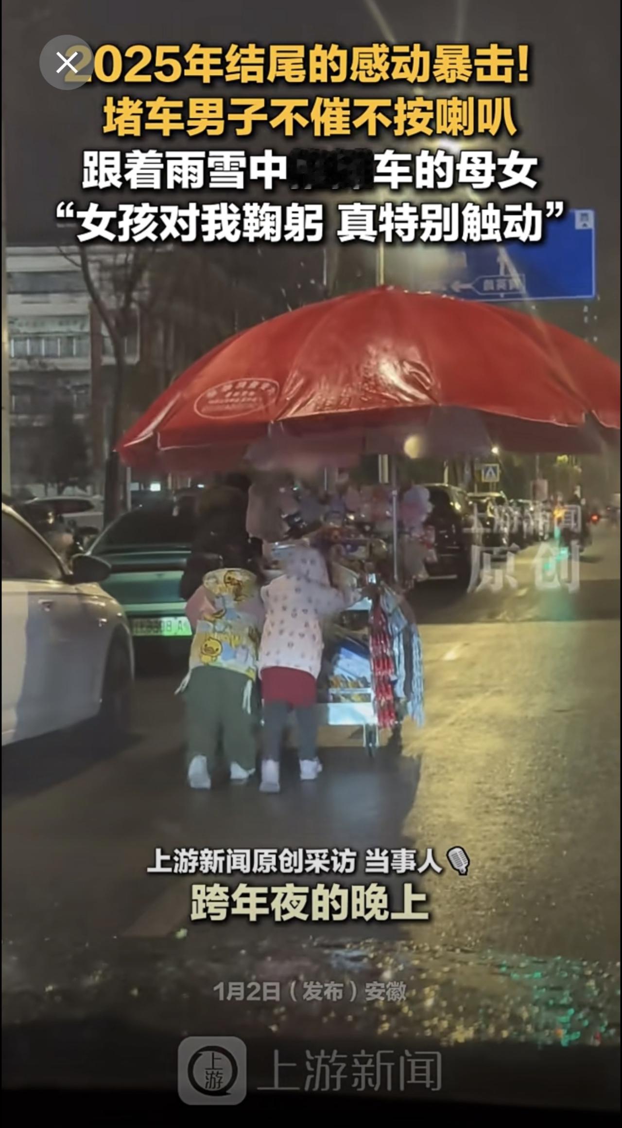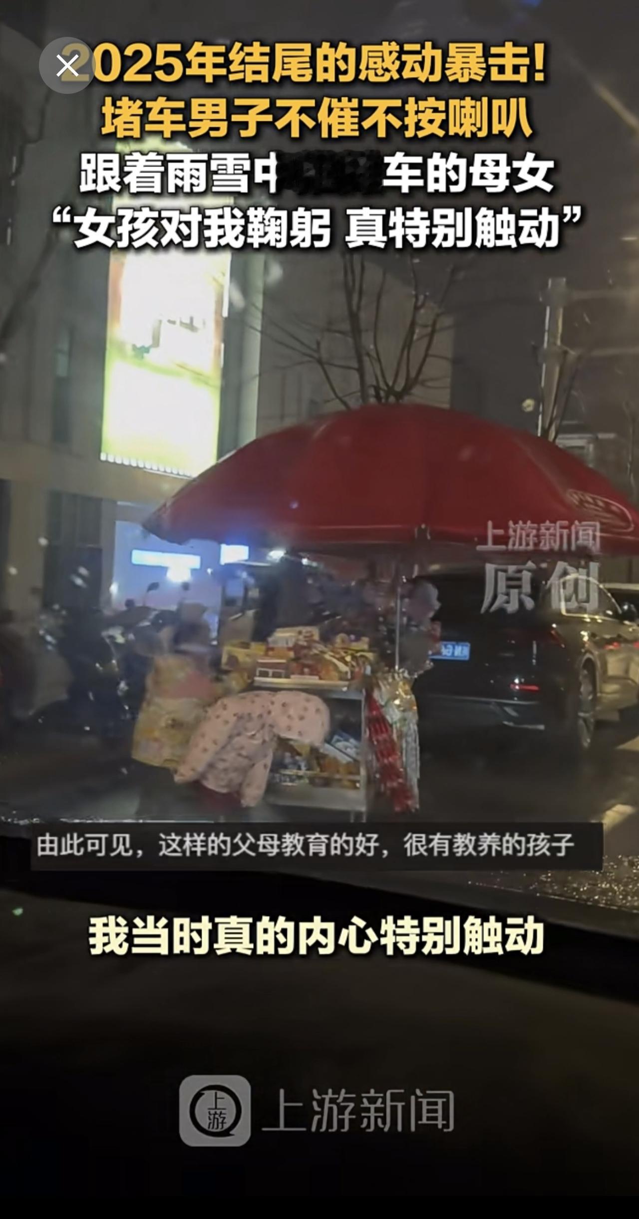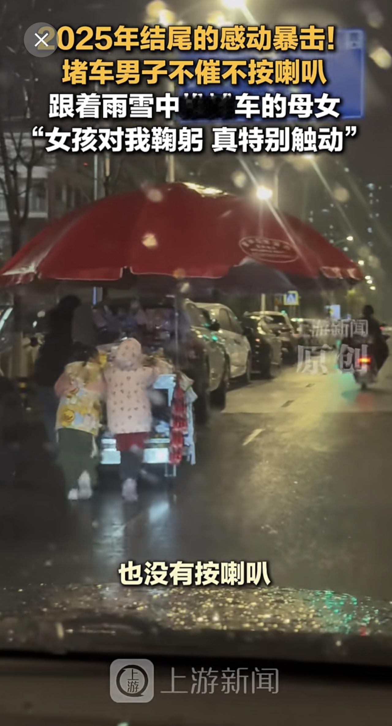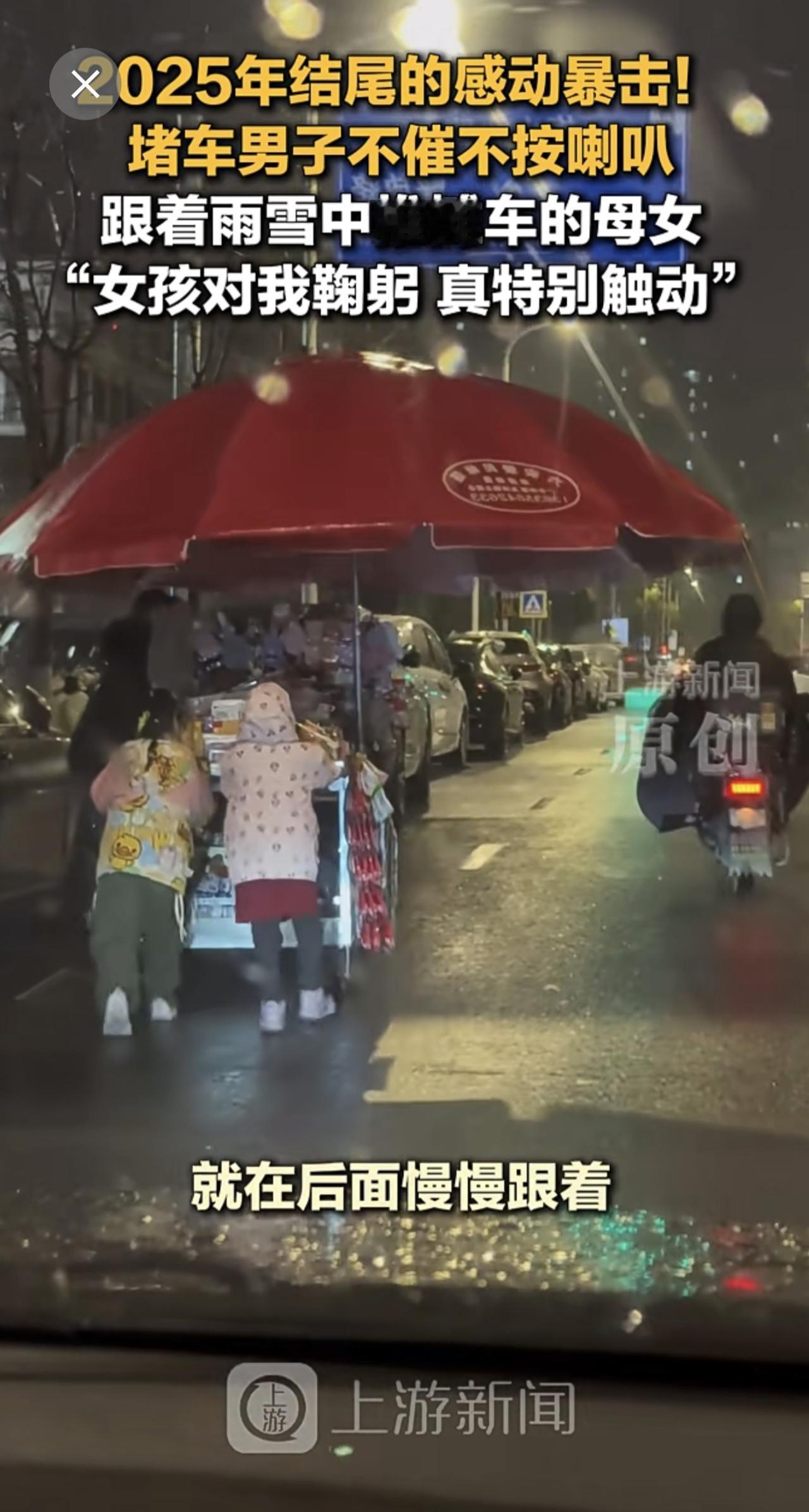 1月2日(发布),2025年结尾的感动暴击!堵车男子不催不按喇叭,跟着雨雪中推摊车的母女,“女孩对我鞠躬 真特别触动”