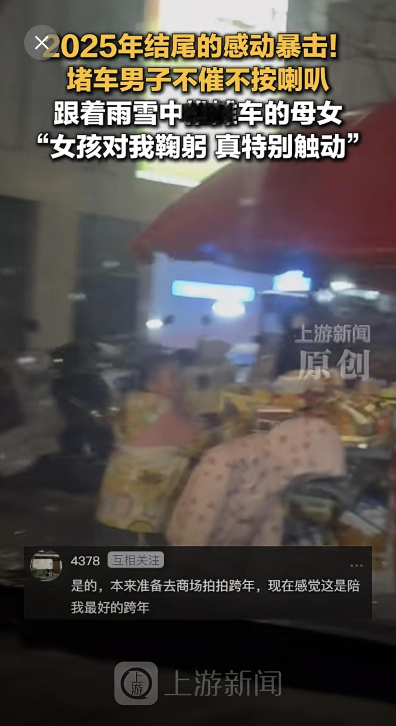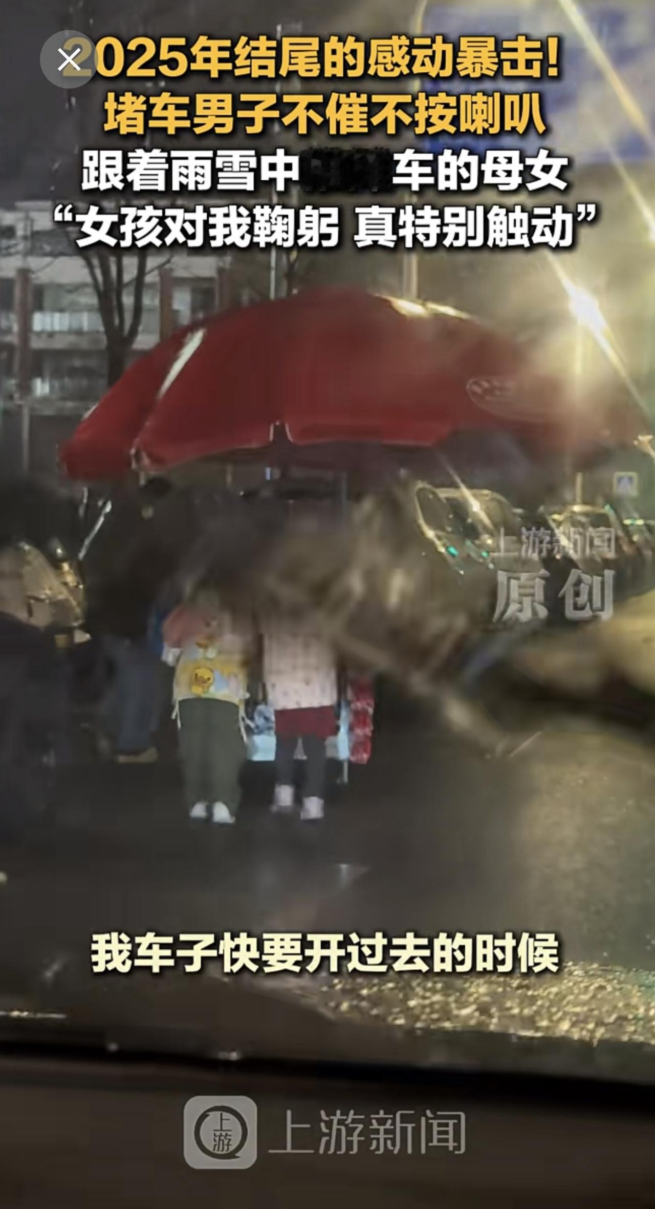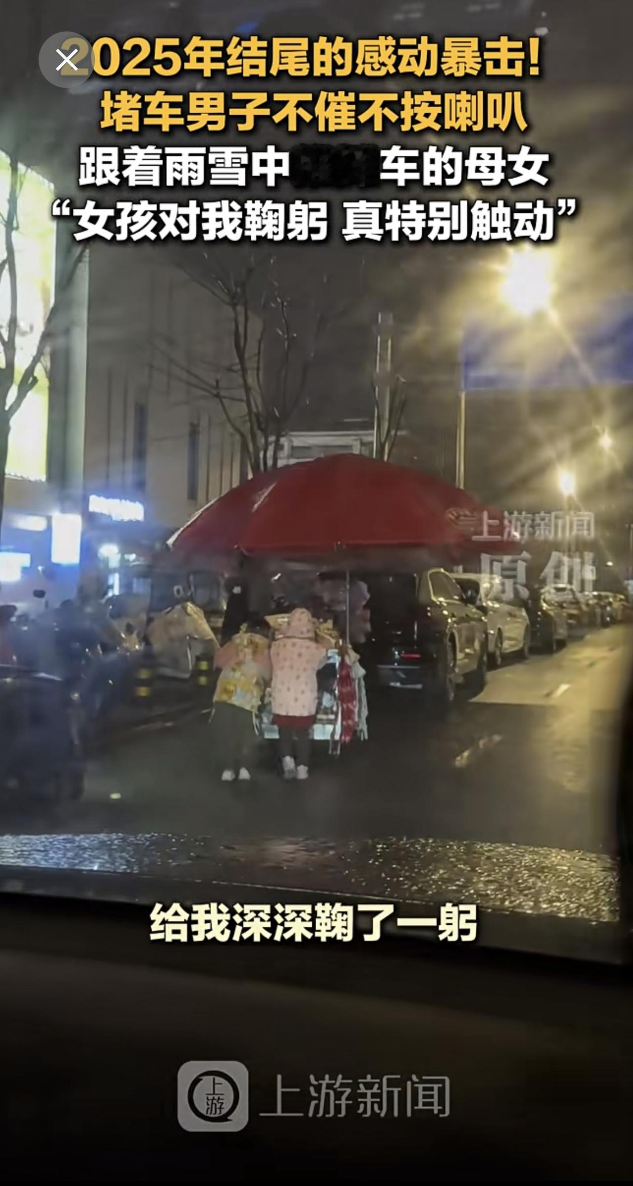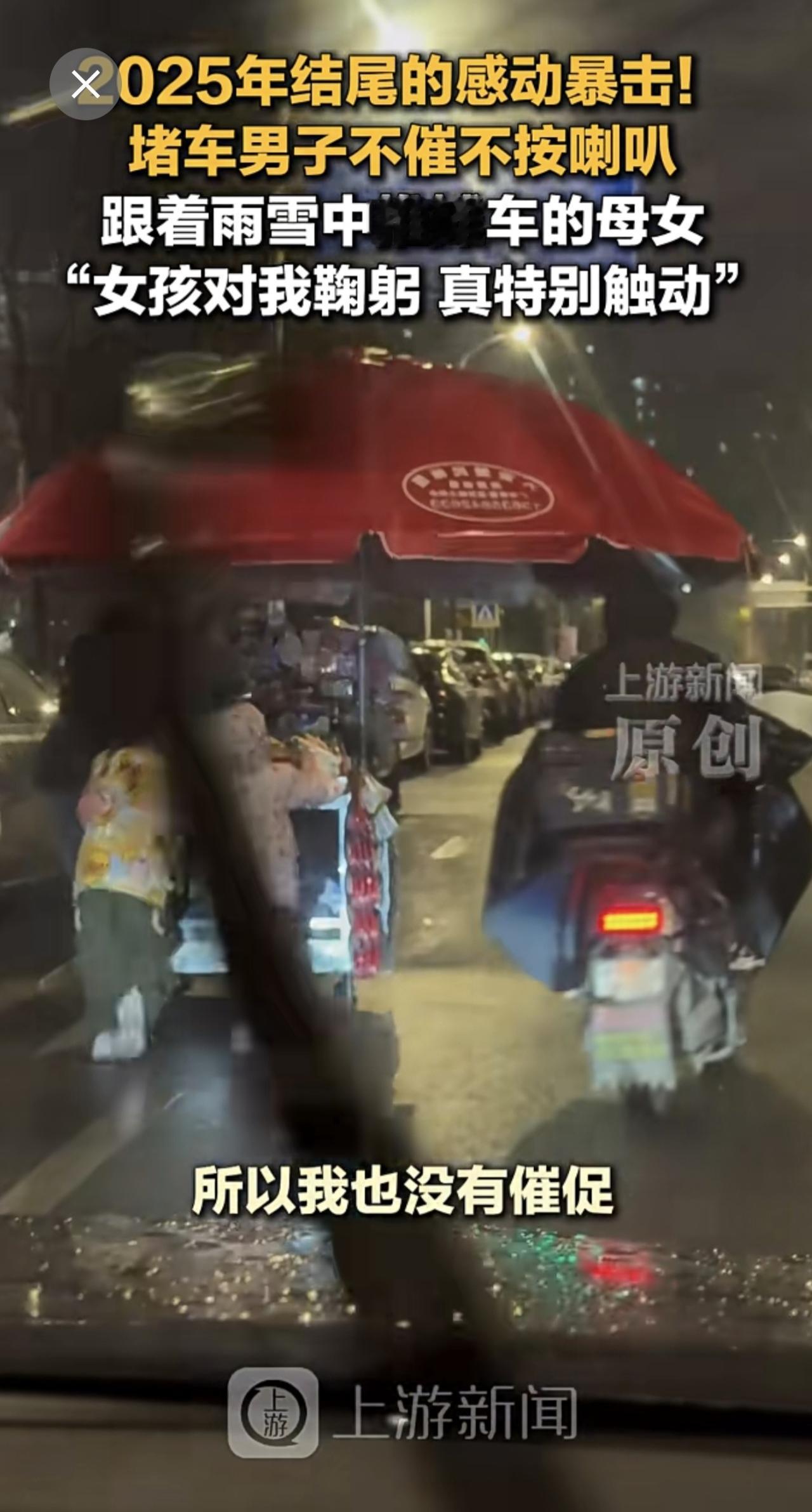 1月2日(发布),2025年结尾的感动暴击!堵车男子不催不按喇叭,跟着雨雪中推摊车的母女,“女孩对我鞠躬 真特别触动”