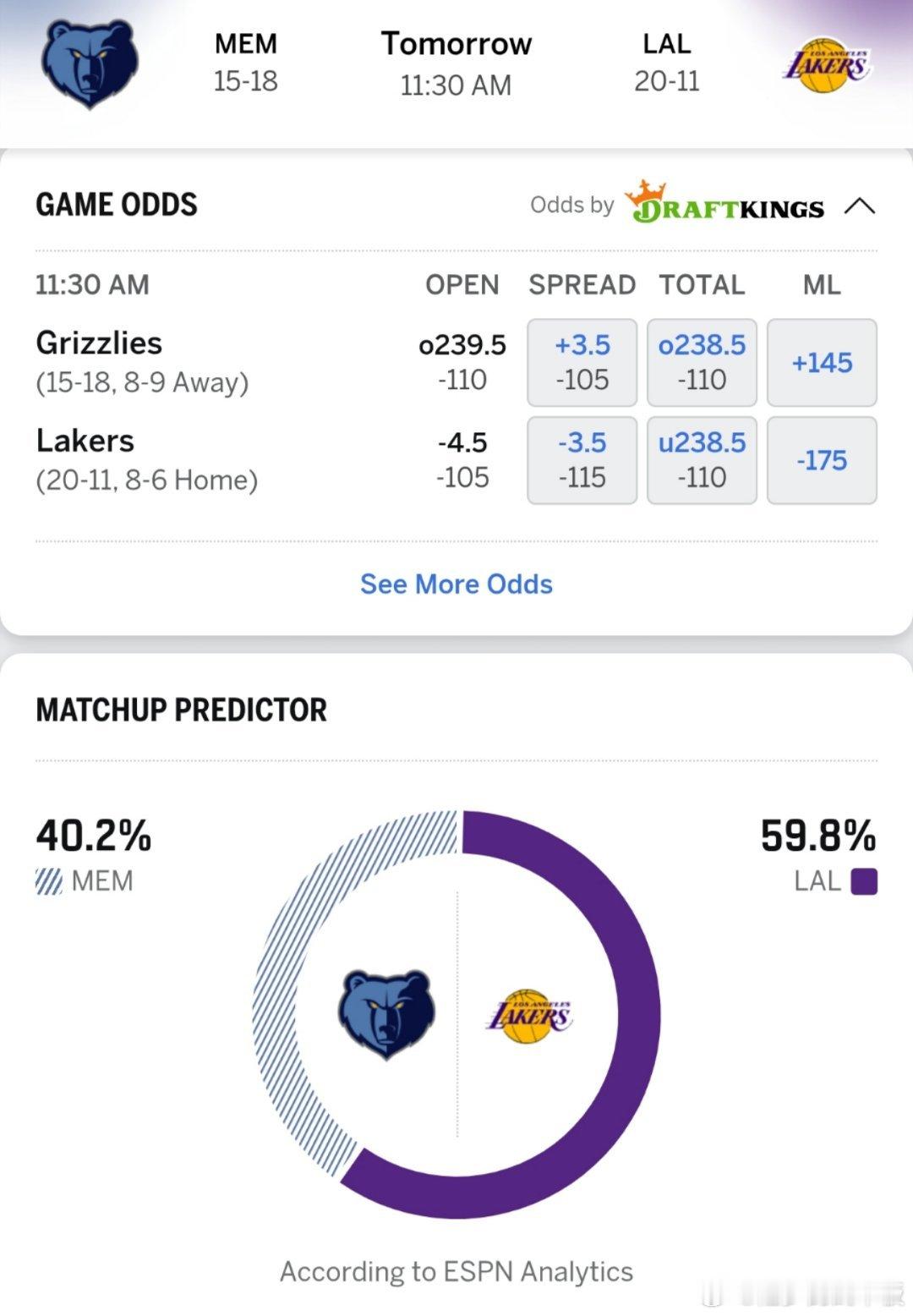 胜率四六开!ESPN预测明日灰熊vs湖人胜率:灰熊40.2%,湖人59.8%,