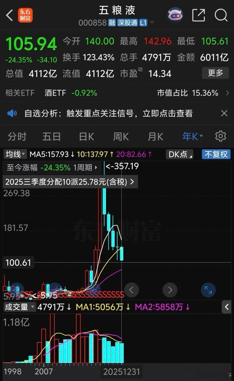 五粮液跌的太惨了,25年暴跌24.35%,12月份天天下跌,稍微有点反弹没多久就冲高回落创新低,本周连续下跌三天不仅创25年牛市新低,还把去年低点106.33跌破了,年线看连续下跌5年,股价不到历史最高价30%,前三季度净利润高达215亿,这么好的业绩市场不仅不炒还一直打压,不少股民纷纷割肉,惨不忍睹,25年是最难把握的牛市,暴涨的股票普遍都是业绩不好的题材股,像五粮液这样业绩好的普遍下跌,但是五粮液更惨,不仅业绩好,股息率高,股民最难接受的是去年牛市涨幅全部跌没了还创新低,股民惨不忍睹。