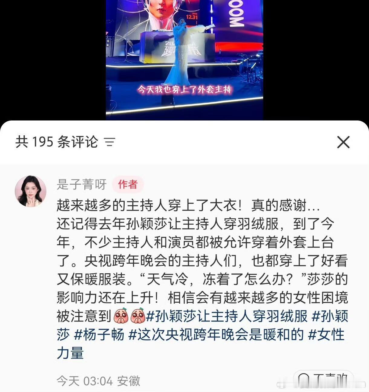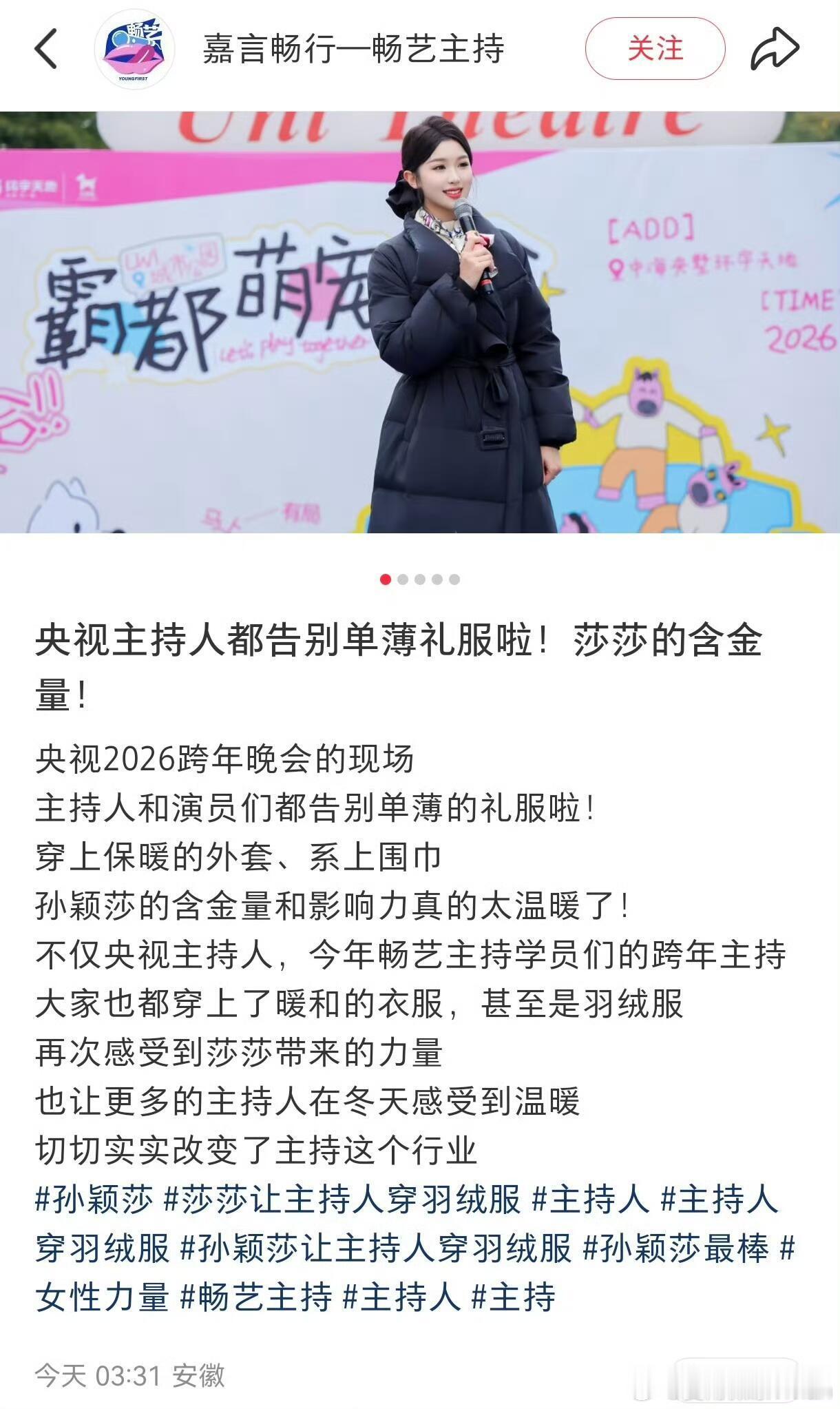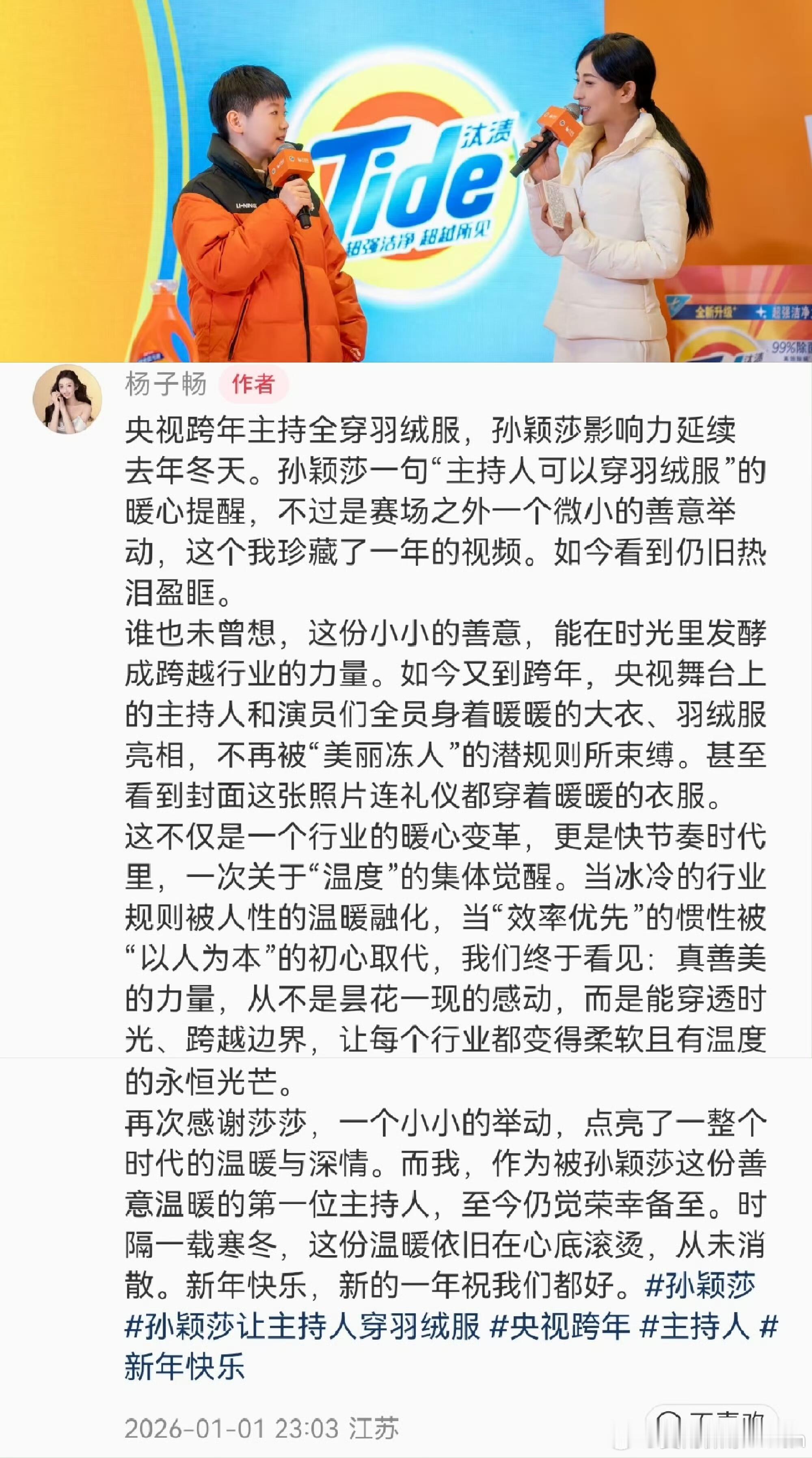 孙颖莎的话让美丽不再冻人 告别薄礼服!央视2026跨年晚会现场,主持人和表演嘉宾们告别单薄的礼服,穿上了保暖大衣,系上围巾。遥想过去,不管多冷的天气,女性表演者或者主持人只要在舞台或者屏幕前都要穿着高端大气且单薄的礼服,没有人会在意,可就在之前的汰渍商务活动中,孙颖莎建议主办方让女主持人穿羽绒服保暖。不愧是名字里有“Sun”和“小太阳”美誉的莎莎,这样细心又温暖的莎莎,值得所有人的喜欢,从侧面也印证了“孙颖莎”这三个字的含金量,与此同时被照顾的不仅仅是女性,男主持人也同样被惠及到了,看到图片里很多人都因为孙颖莎得到更好的照顾,泪目了,也在心里发出“喜欢孙颖莎不后悔,因为她值得”的感慨。我不止一次的夸孙颖莎,孙颖莎一直都是纯粹的、温暖的,她有着不一般的格局、人品、球品、大局观、责任感和团队意识,这样的榜样,是值得当代人喜欢和追捧的。。