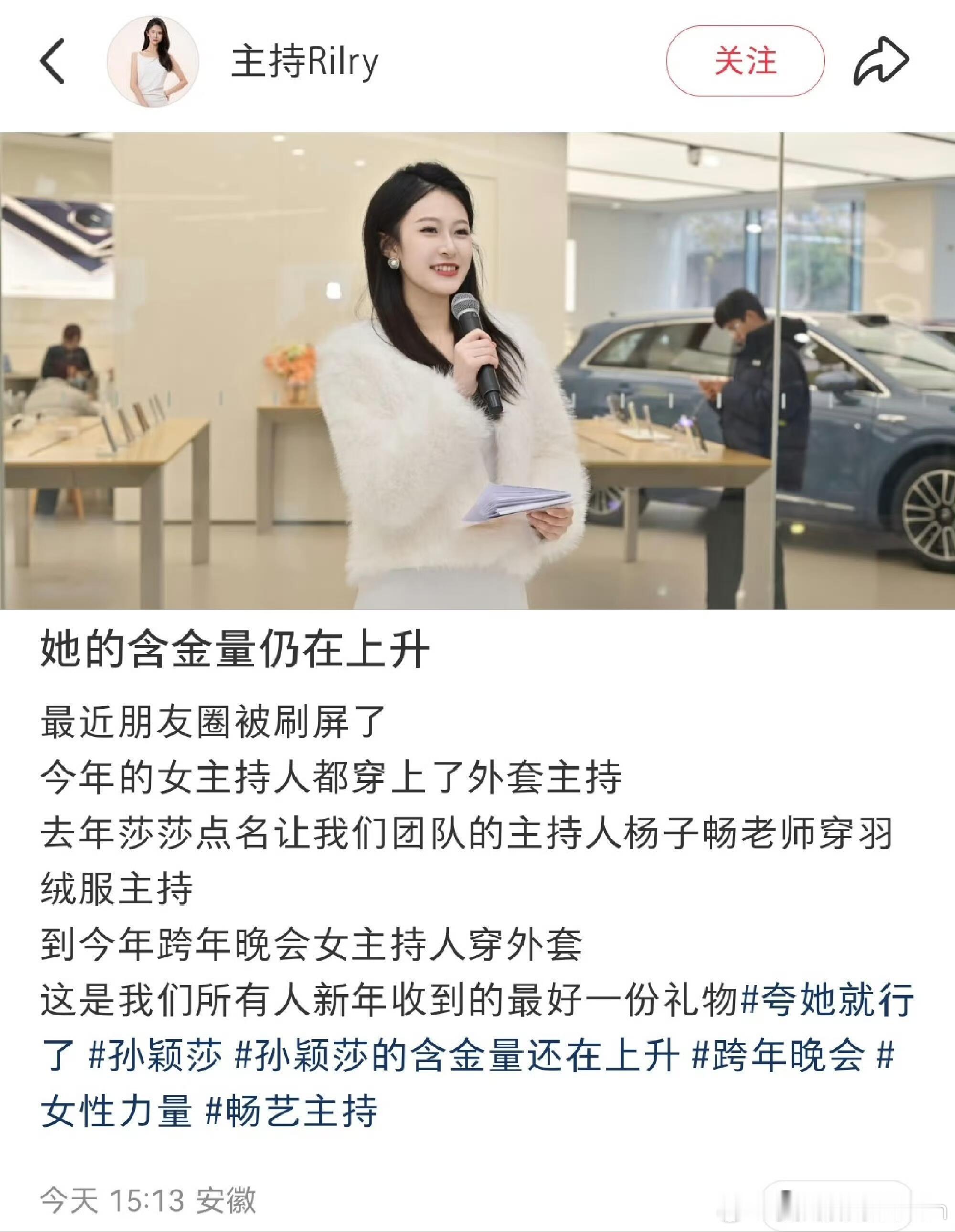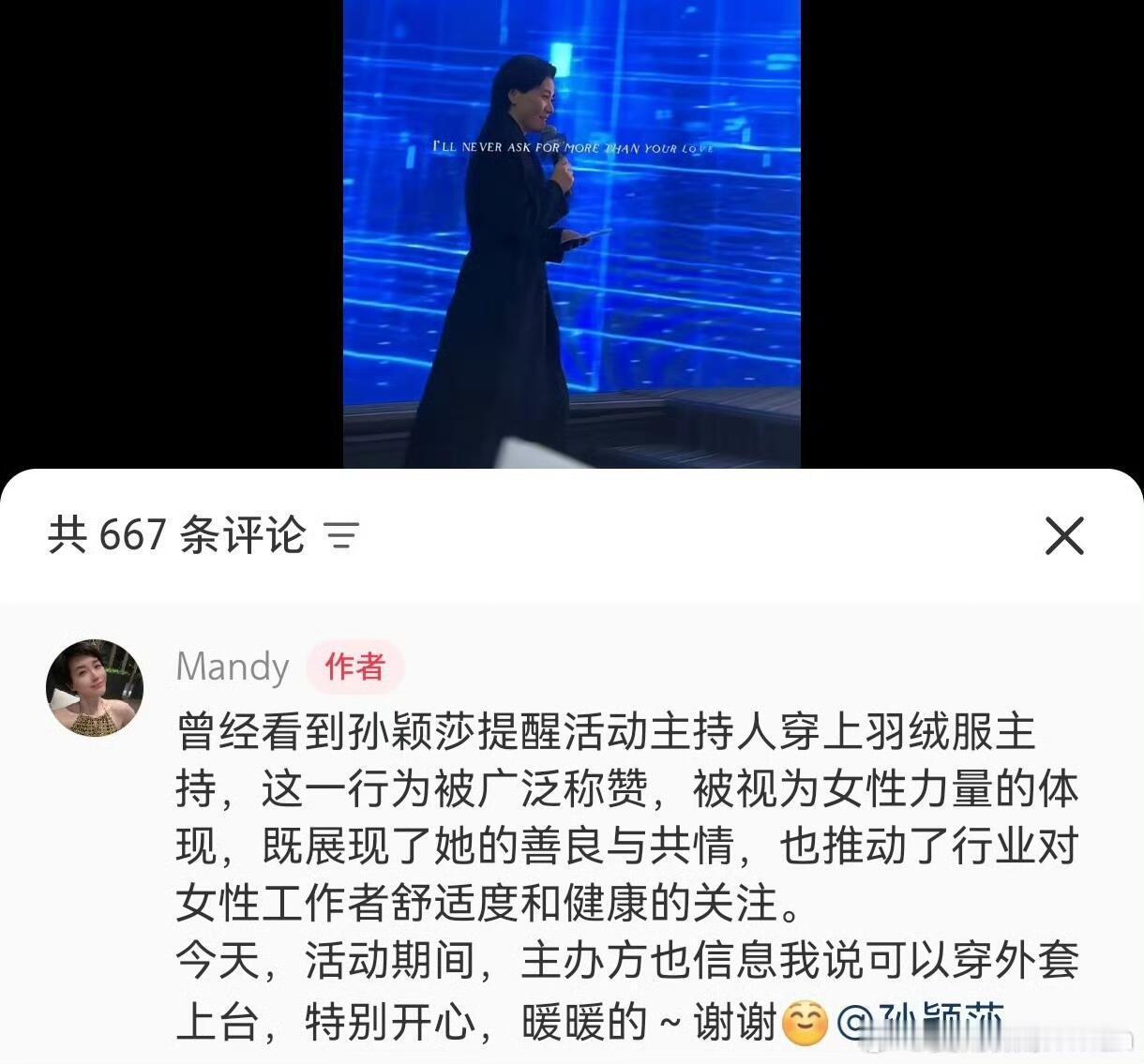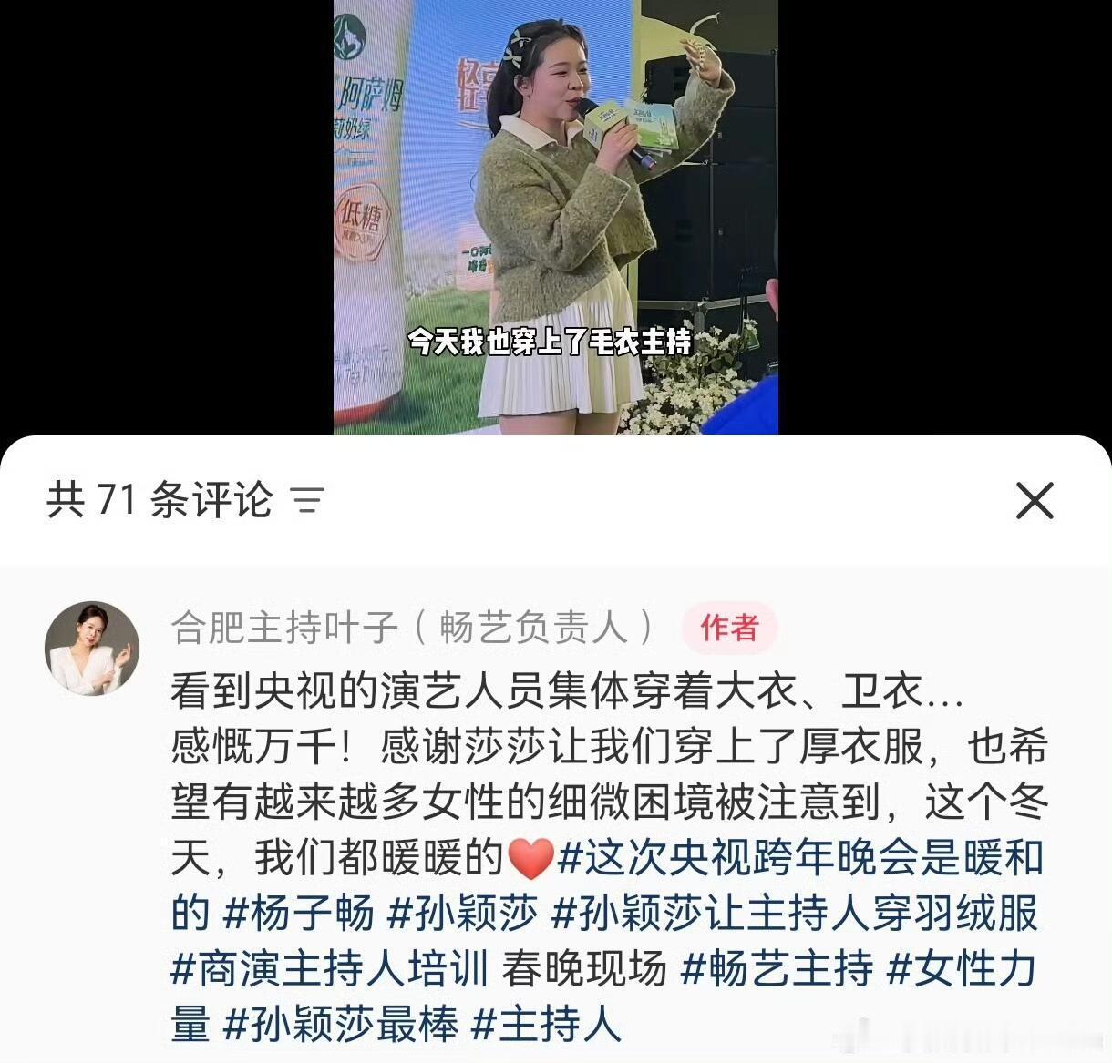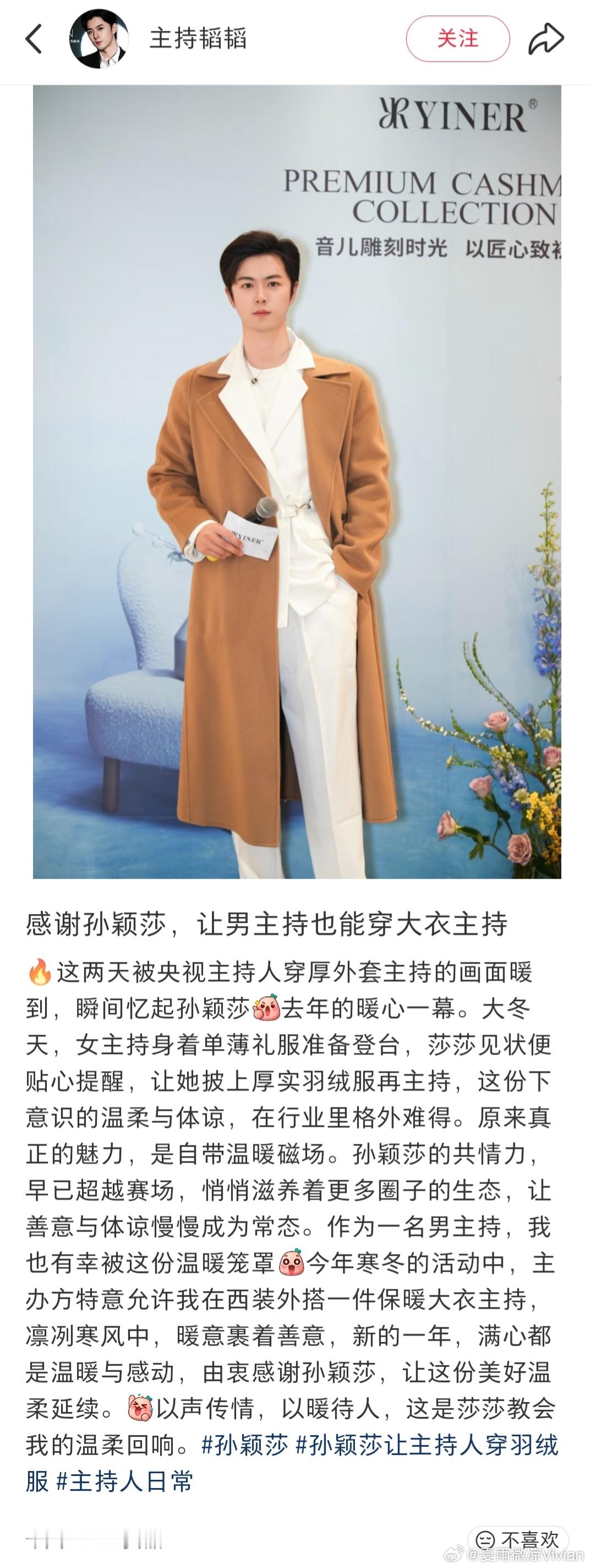 孙颖莎的话让美丽不再冻人 告别薄礼服!央视2026跨年晚会现场,主持人和表演嘉宾们告别单薄的礼服,穿上了保暖大衣,系上围巾。遥想过去,不管多冷的天气,女性表演者或者主持人只要在舞台或者屏幕前都要穿着高端大气且单薄的礼服,没有人会在意,可就在之前的汰渍商务活动中,孙颖莎建议主办方让女主持人穿羽绒服保暖。不愧是名字里有“Sun”和“小太阳”美誉的莎莎,这样细心又温暖的莎莎,值得所有人的喜欢,从侧面也印证了“孙颖莎”这三个字的含金量,与此同时被照顾的不仅仅是女性,男主持人也同样被惠及到了,看到图片里很多人都因为孙颖莎得到更好的照顾,泪目了,也在心里发出“喜欢孙颖莎不后悔,因为她值得”的感慨。我不止一次的夸孙颖莎,孙颖莎一直都是纯粹的、温暖的,她有着不一般的格局、人品、球品、大局观、责任感和团队意识,这样的榜样,是值得当代人喜欢和追捧的。。