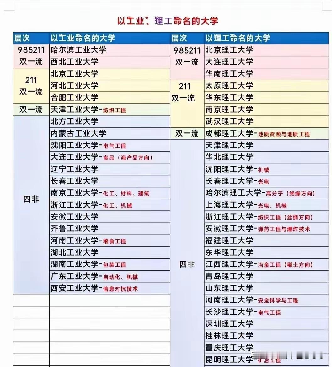 四非大学中的工业和理工谁最强?这问题挺有意思,咱们就结合图片内容,好好唠唠。 先从“工业”类“四非”大学说起。图片里这列名单可不短,像南京工业大学、广东工业大学、浙江工业大学等都赫赫有名。其中,浙江工业大学特别亮眼——它的优势学科是化工、机械,甚至远超211,综合实力仅次于两所985。从我了解的情况看,浙工大在浙江乃至全国确实口碑很好,化工、机械这些王牌专业就业强劲,科研产出也扎实,说是“四非”中的领头羊之一不为过。其他如南京工业大学(化工、材料、建筑)和广东工业大学(自动化、机械)也实力不俗,但整体上,浙工大在“工业”类“四非”中综合优势更突出,堪称“隐形冠军”。 再来看“理工”类“四非”大学,这列更是群星闪耀。图片里列出了昆明理工大学、长春理工大学、长沙理工大学等,他们都具备双一流实力。昆明理工的矿冶工程是看家本领,在矿业领域影响力很大;长春理工以光电闻名,行业内认可度高;长沙理工的电气工程也很强势,就业指向明确。此外,像哈尔滨理工大学(高分子绝缘方向)、上海理工大学(光电、机械)都有特色专长。这些学校虽没“双一流”名头,但学科精度高,在各自领域能跟211高校掰手腕,整体实力不容小觑。 那么,谁更强?这得看从哪个角度比。如果论综合实力和全国影响力,“工业”类的浙江工业大学可能略胜一筹——它学科覆盖面广,化工、机械等主干学科强劲,加上地处经济活跃的浙江,发展势头猛,确实有“远超211”的底气。但“理工”类大学也不弱,昆明理工、长春理工、长沙理工等校在特色学科上深度突出,行业积淀深厚,尤其昆明理工的矿冶、长春理工的光电,都是国家级重点领域,具备冲击“双一流”的潜力。可以说,“理工”类强校更多元,整体阵营更庞大。 综合来看,如果硬要挑个“最强”,浙江工业大学在“四非”工业类中优势明显,综合实力接近中游211水平;而“理工”类则是多点开花,昆明理工等校在细分领域顶尖。但教育评价从来不是“一刀切”,选大学得看专业匹配。对于考生,如果追求综合发展和地域优势,浙工大是好选择;如果钟情特色专业,那些“理工”强校可能更对口。总之,这些“四非”大学用实力证明,没标签也能发光,这才是高等教育的活力所在。