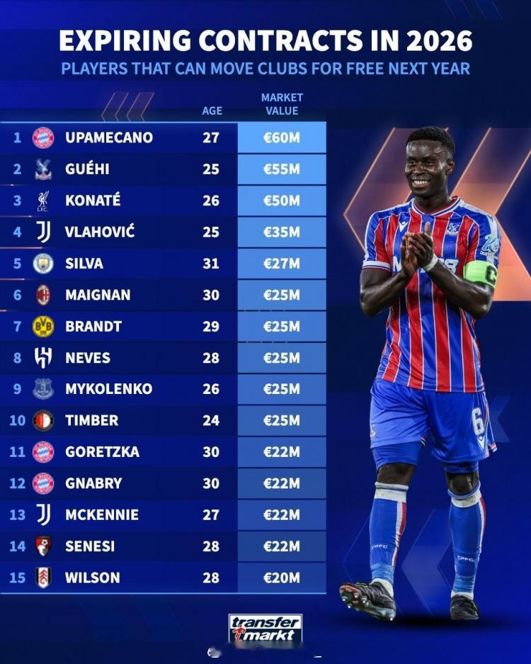 德转列合同到期身价榜:欧元1. 于帕梅卡诺(拜仁),27岁,6000万2. 格伊(水晶宫),25岁,5500万3. 科纳特(利物浦),26岁,5000万4. 弗拉霍维奇(尤文),25岁,3500万5. B席(曼城),31岁,2700万6. 迈尼昂(米兰),30岁,2500万7. 布兰特(多特),29岁,2500万8. 鲁本·内维斯(利雅得新月),28岁,2500万9. 维塔利·米科连科(埃弗顿),26岁,2500万10. 昆滕·廷伯(费耶诺德),24岁,2500万11. 格雷茨卡(拜仁),30岁,2200万12. 格纳布里(拜仁),30岁,2200万13. 麦肯尼(尤文),27岁,2200万14. 塞内西(伯恩茅斯),28岁,2200万15. 哈里·威尔逊(富勒姆),28岁,2000万