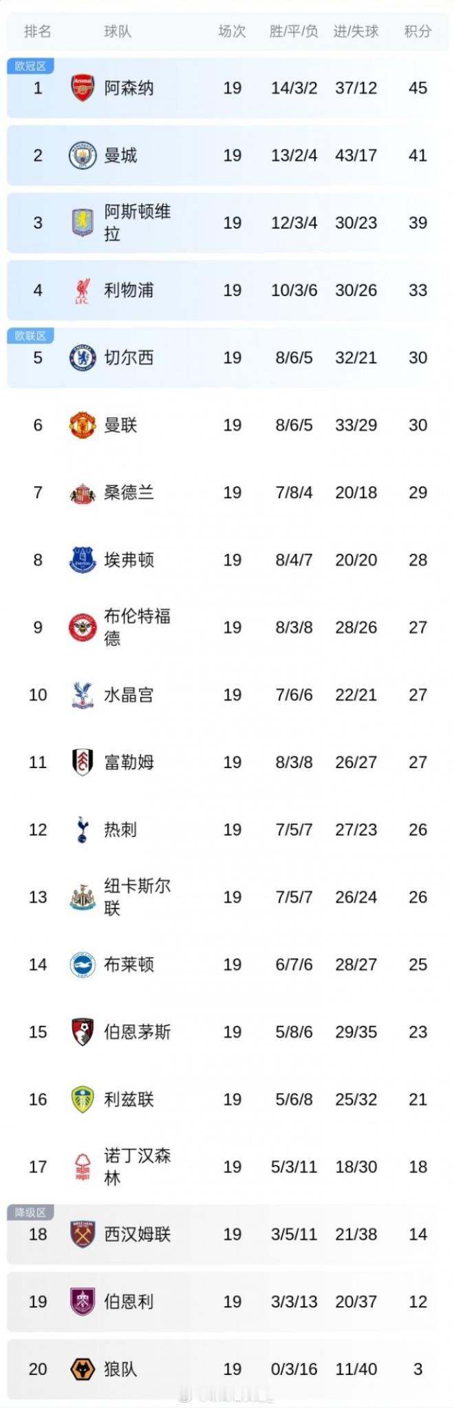 英超球队半程评级:阿斯顿维拉、桑德兰:A*阿森纳、曼城、布伦特福德:A水晶宫、利兹联:A-曼联、埃弗顿、布莱顿:B-富勒姆:C+利物浦、切尔西、热刺:C纽卡、伯恩茅斯:D伯恩利:D-诺丁汉森林:戴奇上任前F,上任后B-西汉姆联:F狼队:F-半程过后英超积分榜↓