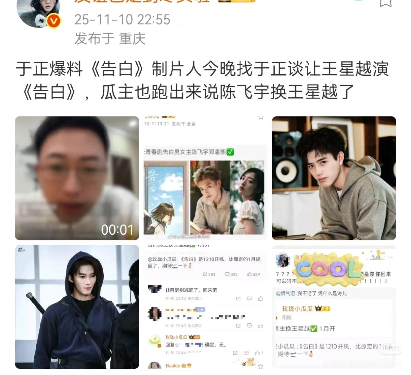 之前拿陈飞宇热饼的《告白》一月开机了。主演是王星越x邓恩熙 ,青春剧主演名单:王星越 饰演飞行员周京泽,邓恩熙 饰演医生许随,配角包括颜安、孙青惠,吴宣仪、毕雯珺等可能特别出演。制作进度:计划2026年1月宁波开机,导演张笑安(代表作《树下有片红房子》),共28集。主线故事:改编自应橙同名小说,讲述许随高中暗恋周京泽,大学相恋后因误会分手,八年后重逢破镜重圆。副线聚焦好友胡茜西与盛南洲的BE爱情
