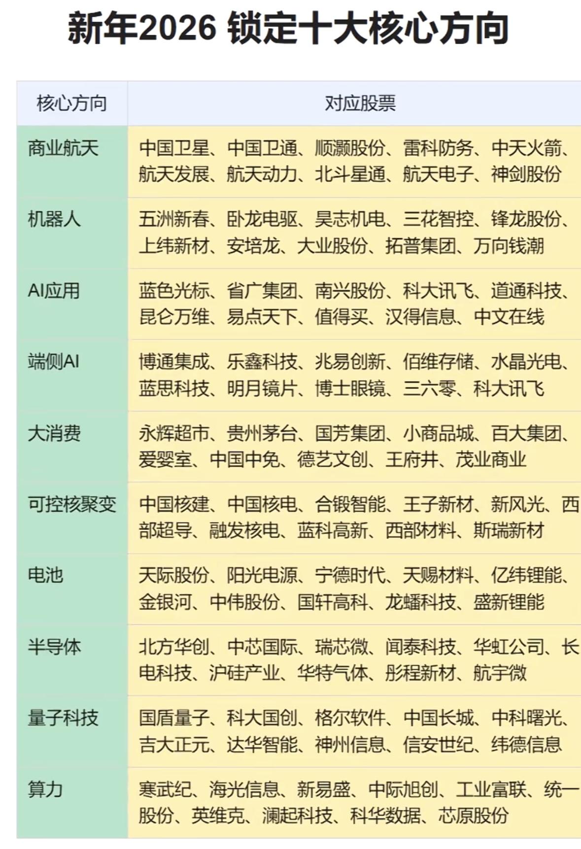 2026年十大核心方向投资指南,锁定未来财富! "2026十大投资风口:航天军工、 机器人、AI应用、消费升级、核聚变、 新能源电池、半导体、量子科技、 算力基建。龙头股全梳理, 布局未来硬科技!"