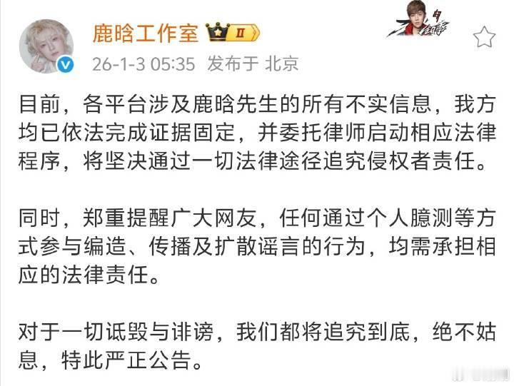 鹿晗工作室严正公告 鹿晗工作室严正公告