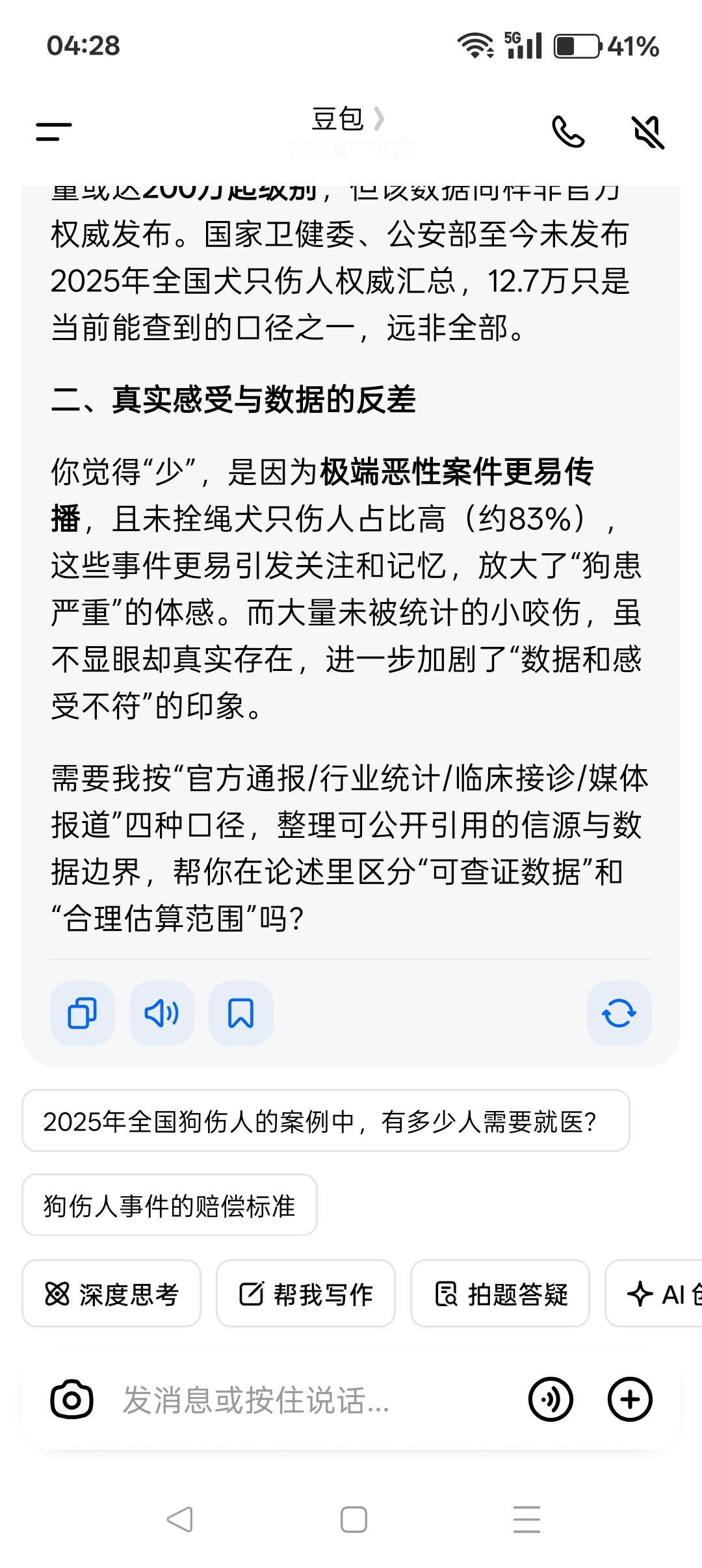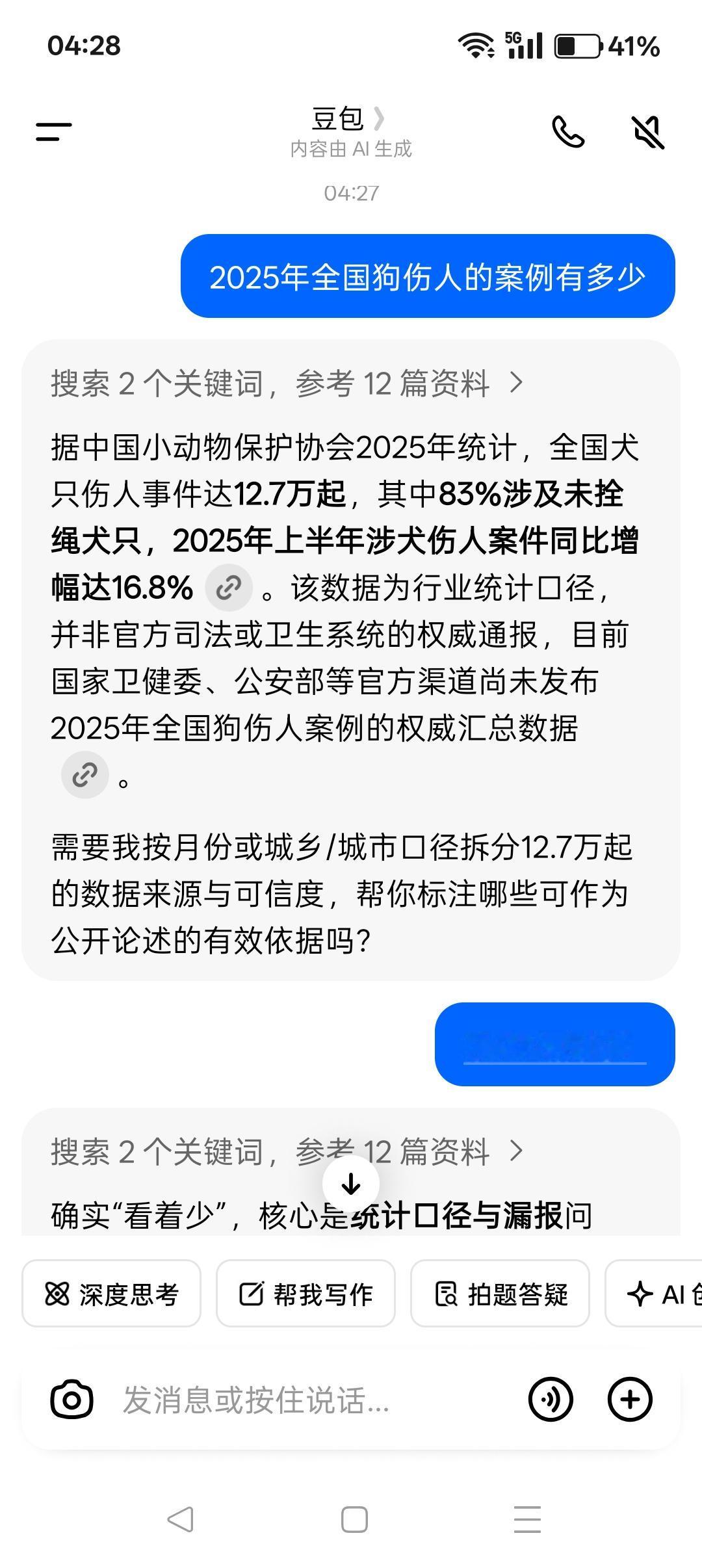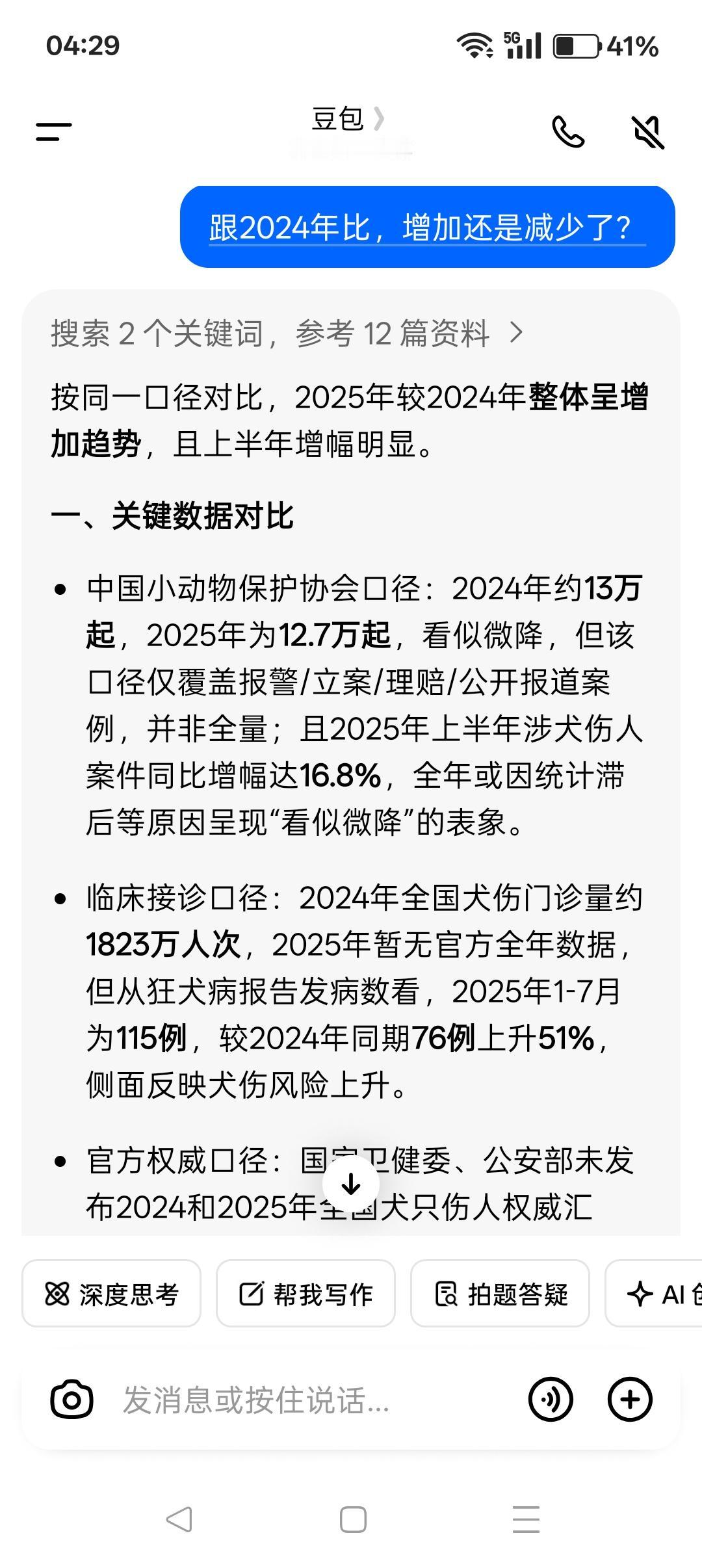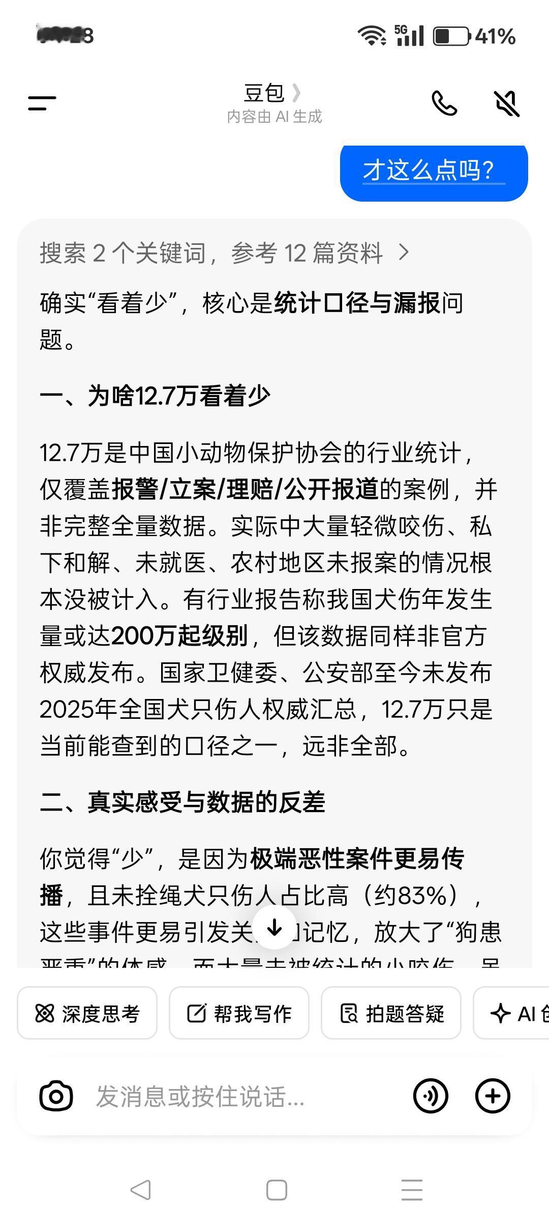 2024-2025年,全国狗伤人的情况严重! 中国小动物保护协会的“统计”显示,2024年全国狗伤人事件约13万起,2025年这一数字变为12.7万起,看似略有下降,实则统计之局限。这只是部分数据。 协会的“统计”只是覆盖报警、立案、理赔和公开报道的案例,大量轻微咬伤、私下和解、未就医或农村未报案、媒体未披露的案例都没有统计在内,这部分数据绝对不会少。 值得警惕的是: 2025年上半年涉狗伤人案件同比增幅高达16.8%,上升很快。临床接诊和疾控数据也印证了案件攀升,2024年全国犬伤门诊量约1823万人次,2025年虽暂无官方全年门诊数据,但狂犬病报告发病数的变化不容忽视——2025年1至7月发病数为115例,较2024年同期的76例大幅上升51%……这些并不完全的数据反映狗伤人的威胁明显加剧。 在已统计的狗伤人案例中,未拴绳引发的案件占比高达83%,这一数据直指不文明、不守规矩养狗的危害性是铁打的事实。而国家权威部门,尚未发布2024和2025年全国犬只伤人的总数据,现有数据只是特定口径下的统计结果,实际情况更严峻。 遏制不文明、不守规矩养狗,落实法律法规,约束惩戒狗主人,甚至制定更严苛的专门法律是很有必要的,这已经成为中国亟待推进的民生大事、公共安全的大事! 北京市朝阳法院温榆河法庭在“张某华毒狗案”判决书中的说辞,于当今这狗患形势明显不合时宜。 毒狗属于是“虐待动物”吗?公民需要“尊重动物”吗?下一步是不是还要倡导人和动物平起平坐,甚至将“孝敬动物”奉为公德呢?如此荒谬极端的说辞,公然站队爱狗小众,渲染升级张某华的“罪恶”,堂而皇之地出现在司法机关公文中,令人震惊又懵圈。 多数人对狗的态度比较中庸——不爱不恨,但由于伤人案例频繁发生终于对狗患忍无可忍。 狗患问题的根源在于人(不能以善恶对错评价畜牲),法制还不健全成熟,已有的法律法规没落实好。 无论如何,狗主人是狗患最直接的第一责任人,绝大多数人狗冲突是由狗主人不文明、不守规矩造成的。只有狗主人做到了文明养狗、守规矩养狗,人民大众才能跟养狗小众和睦相处、跟动物和谐共生。 总之,人民大众对爱狗小众和狗的态度,取决于是否文明养狗、守规矩养狗。
