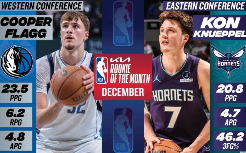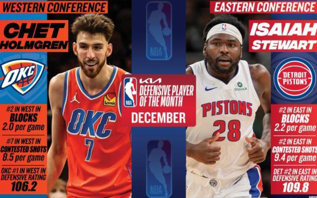 1月3日,NBA官方公布12月份各大月度最佳奖项。 月最佳球员 西部:亚历山大,雷霆 12月场均31.4分6.1助攻,命中率59.4%,雷霆9胜4负。 东部:布朗森,尼克斯 12月场均30.6分7.1助攻,三分命中率40.5%,尼克斯10胜4负。 月最佳防守球员 西部:霍姆格伦,雷霆 12月场均2盖帽(西部第二),场均8.5次干扰投篮(西部第七),雷霆防守效率西部第一(103.6)。 东部:斯图尔特,活塞 12月场均2.2盖帽(东部第二),场均9.4次干扰投篮(东部第二),活塞防守效率东部第二(109.8)。 月最佳新秀 西部:弗拉格,独行侠 12月场均23.5分6.2篮板4.8助攻。 东部:克尼普尔,黄蜂 12月场均20.8分4.7助攻,三分命中率46.2%。 月最佳教练 西部:米奇·约翰逊,马刺 12月带领球队拿到11胜3负的联盟月最佳战绩。 东部:乔·马祖拉,凯尔特人 12月带领球队拿到9胜3负的东部月最佳战绩。