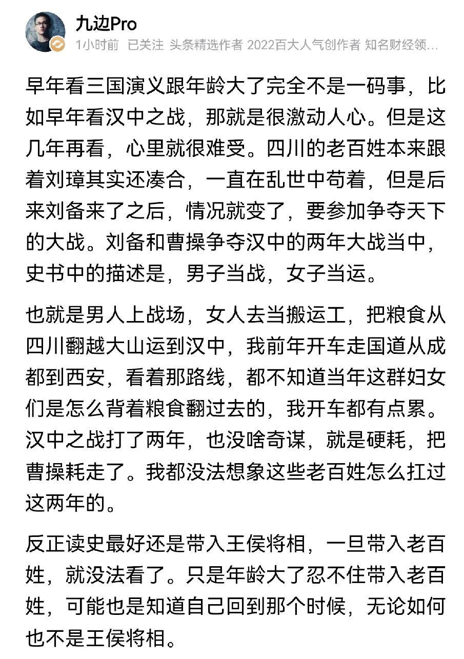 九边:历史一旦代入百姓的视角就没法看了。 九边说看《三国演义》,年轻时看得感受和现在看得感受完全不同。年轻时候眼里都是刀光剑影,鼓角争鸣。而经过了生活的磨练,岁月的沉淀,现在再看三国演义,眼里除了王侯将相,更多了一些对天下苍生的惦念。 我们读史很容易被宏大叙事所吸引,被成王败寇的快意恩仇所折服。其实那些叙事的真假我们不得而知,但被宏大叙事掩盖下的黎民百姓的生活却是真实存在的。就像文中说的汉中之战,地方诸侯割据争霸下,是四川的老百姓“男子当战,女子当运”,一边是一将功成万骨枯,一边是翻越崇山峻岭。而这些很少被史学家所更关注,更没有多少人愿意多看几眼。 其实当如今,也不过时。比如现在,我们总是对远方的宏大叙事格外关心,却对身边的与我们关联的密切的小事漠不关心。而真正影响我们自身的,其实不是远方的宏大叙事,而是身边的平凡小事。