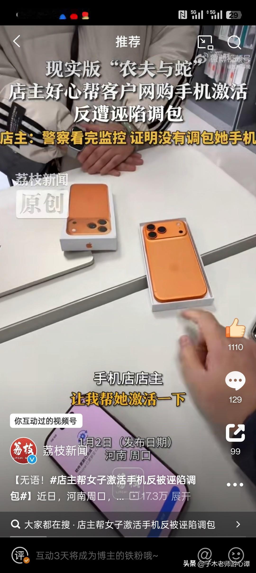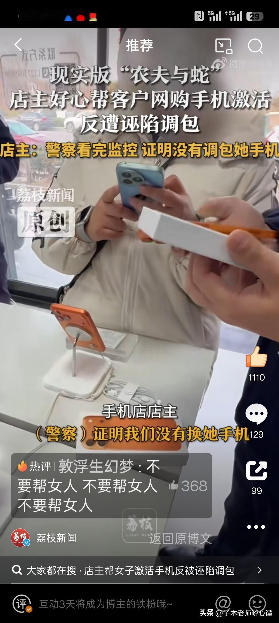 近日,河南周口一手机店主好心帮客户激活网购手机,发现手机是假货后还帮其联系卖家。 次日该客户却指控店主调包手机,并堵在店门口讨要说法。 店主调取店内监控交由警方核查,警方证实店主并未调包,洗清了店主的嫌疑。 好心帮忙反被诬陷调包,这桩事简直寒透了人心! 店主不仅没推脱麻烦,还主动帮着联系卖家,换来的却是无端指责和门口对峙。客户自己买到假货,不找无良卖家追责,反倒把脏水泼向善意伸出援手的人。网友说这样的人,既蠢又坏。 我倒觉得这种人是最有心机的人,整天想着算计人。店主都已经告诉她这是假货,而且这人肯定也在当场,却说店主偷换的她的手机,真是活见鬼!其实目的很简单就是讹人呗! 店主帮女子激活手机反被诬陷调包 幸好监控还原真相,警方还了店主清白。 不然平白蒙受不白之冤,生意和声誉都得受影响。 其实我们在生活中,与人方便时要留好证据,别让好心被当成驴肝肺;遇到问题先查清真相,别不分青红皂白乱咬人。
