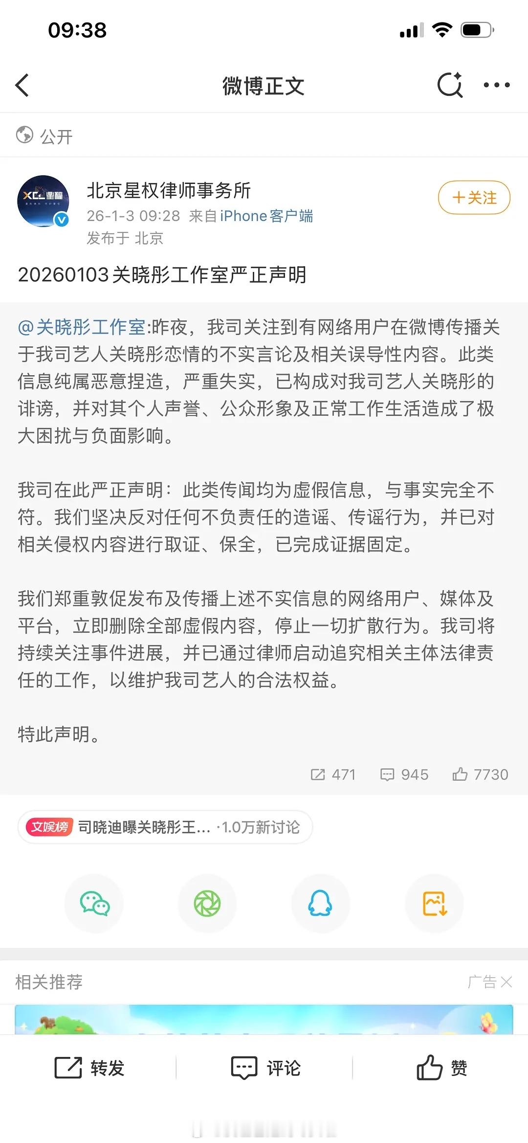 第一个找律师的出来了,嗯,是关晓彤。关晓彤工作室声明 iamroosie 司晓迪