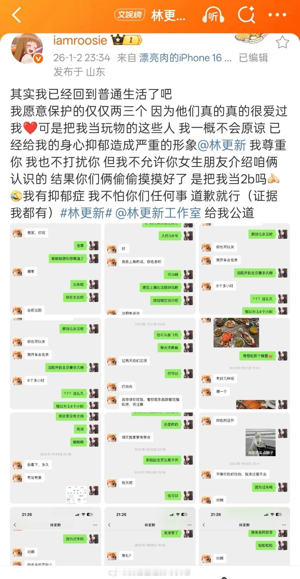 司晓迪曝光的和林更新聊天的截图都是很正常的日常聊天,还在评论区说很多见面细节公开了就涉黄了林更新工作室回应很硬气,也是唯一点名司晓迪的。iamroosie 司晓迪 司晓迪林更新聊天记录