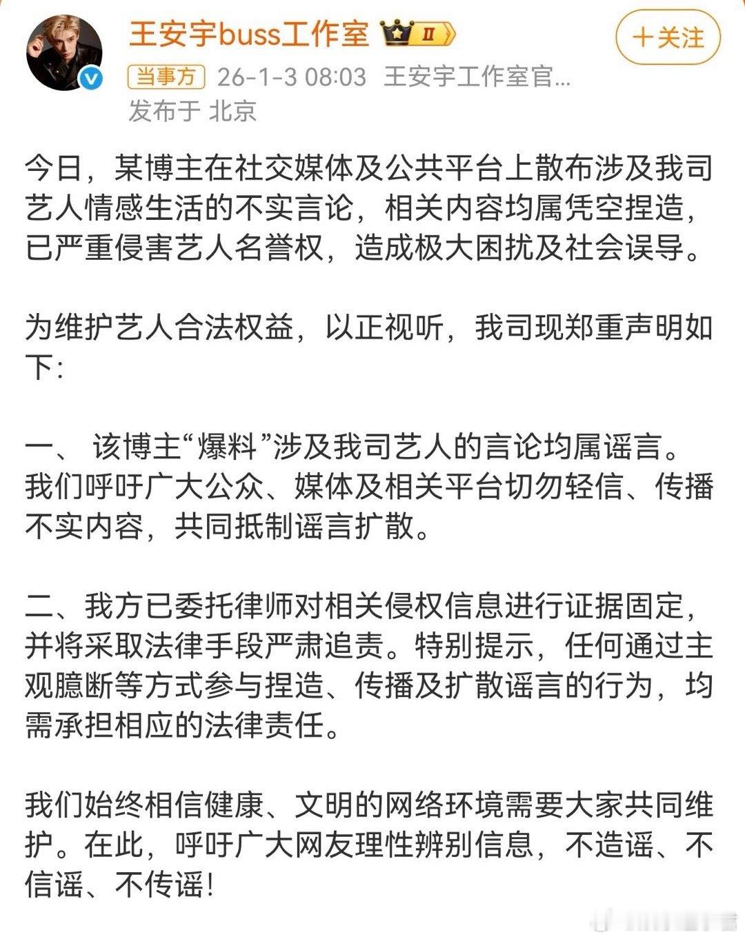 iamroosie鹿晗、范丞丞、林更新、黄明昊、王安宇方面已经辟谣内容。此外,司晓迪爆料关晓彤王安宇在一起了。双方工作室也已经辟谣。