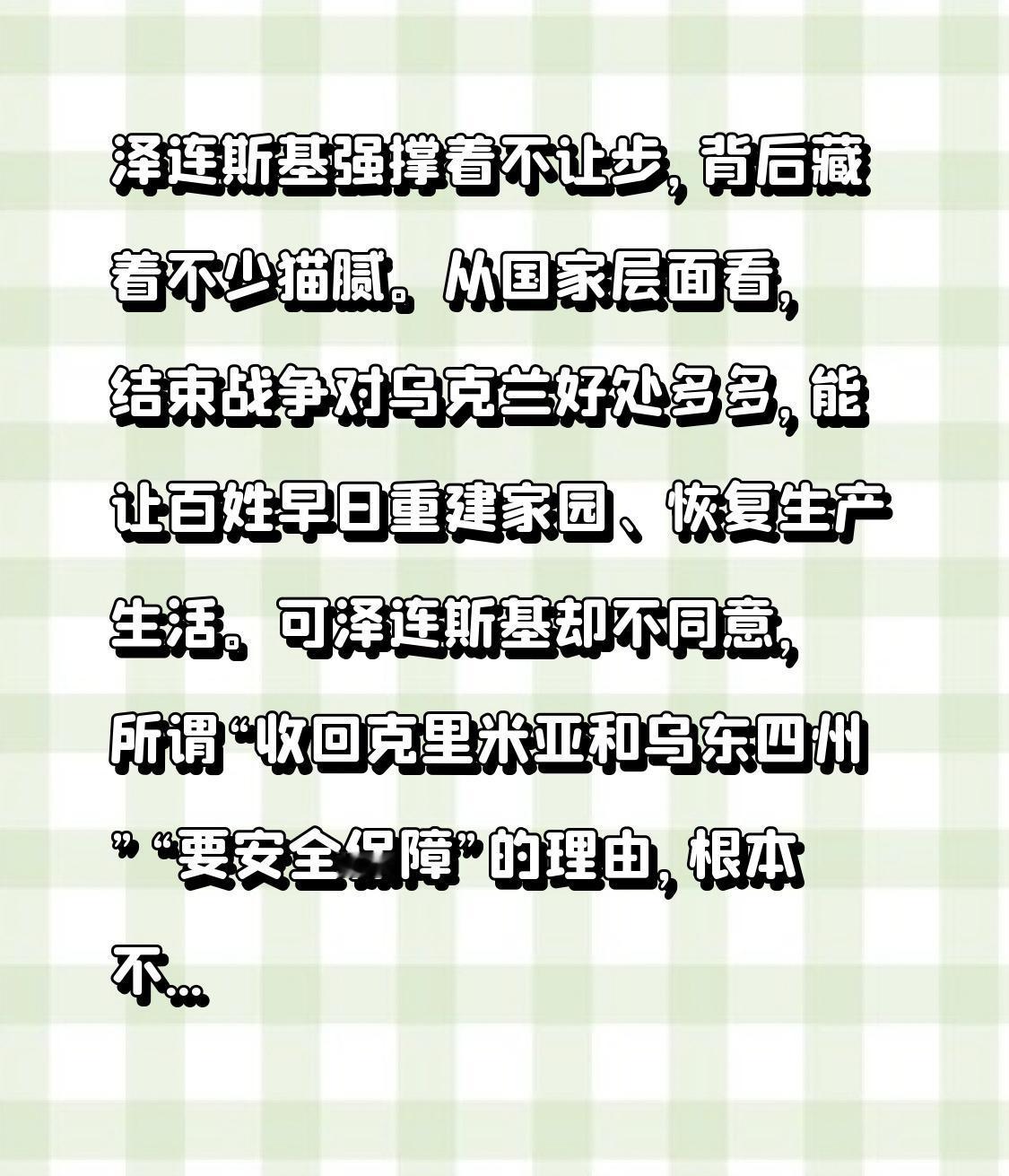 泽连斯基强撑着不让步,背后藏着不少猫腻。从国家层面看,结束战争对乌克兰好处多多,能让百姓早日重建家园、恢复生产生活。可泽连斯基却不同意,所谓“收回克里米亚和乌东四州”“要安全保障”的理由,根本不现实。 其实他更多是出于私利。一旦在领土问题上让步,他的政治前途可能就没了。从乌克兰国内民调来看,虽然近40%的公民为尽快结束战争愿在领土上让步,比两年前增加了三倍,但反对让步的仍有一半人。泽连斯基无视国家利益和部分民众渴望和平的心声,一味强撑,这战争不知何时是个头。