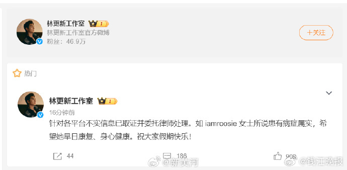 【#林更新方已取证#】1月2日晚,司晓迪#iamroosie#喊话林更新道歉:我有抑郁症 我不怕你们任何事,道歉就行(证据我都有)。3日,发声明:针对各平台不实信息已取证并委托律师处理。如 iamroosie 女士所说患有病症属实,希望她早日康复、身心健康。祝大家假期快乐!#iamroosie 鹿晗# (新黄河)