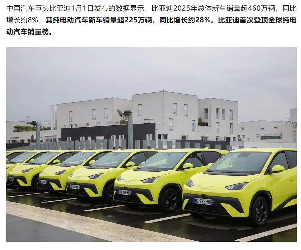 近日,官方媒体发布消息,2025年全球汽车销量,比亚迪首次超过特斯拉夺得电动汽车销售全球冠军。2025年特斯拉全球销售电动汽车163.6万辆,比亚迪2025年全年新车销售460万辆,其中纯电动汽车销售225万辆。对此大家怎么??比亚迪销量超特斯拉成第一 个人认为比亚迪超过特斯拉主要有以下几个方面的原因: 1.比亚迪是制造驱动型公司,而特斯拉是设计驱动型公司。比亚迪是整车公司,从电池、电机、电控、车架、芯片等都是自己设计、生产,生产成本可控,交期稳定可控,价格战也有可伸缩操作的空间。而特斯拉高度依赖外部供应链,一旦进入价格竞争,利润弹性明显不足。 2.比亚迪做矩阵多点开花,特斯拉做爆款后劲不足。比亚迪车型多,轿车、SUV、MPV,价格从5万、10万、15万、20万、30万、100万,价格带全覆盖,满足不同阶层人的用车需求。并且针对海外不同国家制定特定版本,这让特斯拉形成了毛细血管级全球覆盖。而特斯拉,长期坚持少车型政策,Mondel 3、Model Y打天下,车型单一,消费者能选择太少。简单讲,比亚迪赢的是全面占领,而特斯拉赢的是单点爆发。 3.市场不同。比亚迪的增长主要来自中国、东南亚、拉美、中东、以及部分欧洲新兴市场,比亚迪这种多市场分散结构,能让销量保持稳定增长。而特斯拉的核心市场主要集中在北美、欧洲以及一些高购买力的国家,当这些市场增速放缓、补贴退坡、政治摩擦加剧时,没有其他市场可以分担销量增长。 4.车辆定位不同。比亚迪的汽车定位好用、便宜、省钱、内饰豪华,当全球经济疲软、消费者购买力下降时,性价比高的比亚迪汽车成为最佳选择。而特斯拉汽车追求的是科技感、未来感,车辆内饰极简主义,当消费者回归理性时,发现这些都是虚的。 最后想说的是,比亚迪纯电汽车销量超过特斯拉,这不是特斯拉的失败,而是比亚迪所代表的中国工业体系全面成熟的表现。