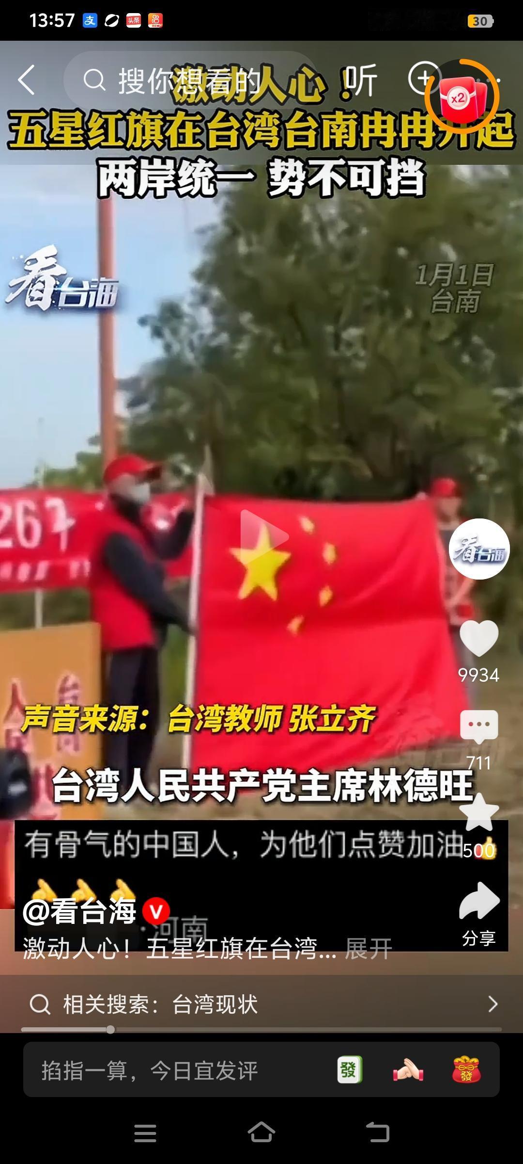 遗民泪尽胡尘里,南望王师又一年。台湾人民把五星红旗于2026元旦在台南升起来了! 2026年元旦,台湾人民共产党主席林德旺,率领200多名党员,在台南新营红船基地,庄严升起了中华人民共和国国旗——五星红旗,让所有盼望海峡两岸统一的中国人不禁热泪盈眶! 南宋爱国诗人陆游有诗云:遗民泪尽胡尘里,南望王师又一年!海峡两岸中国人同根同源同文同种,心系统一的台湾民众还是占大多数。两岸分离了太久了,现在中国强大了,该让台湾回家了! 台湾民众现在主动升起五星红旗说明,如果中国人民解放军去接收台湾,完全有可能出现1949年我中国人民解放军进入北平时、各界群众夹道欢迎人民解体军的盛况,毕竟两岸统一大势所趋,再拖可能会让沸腾的热血结冰。
