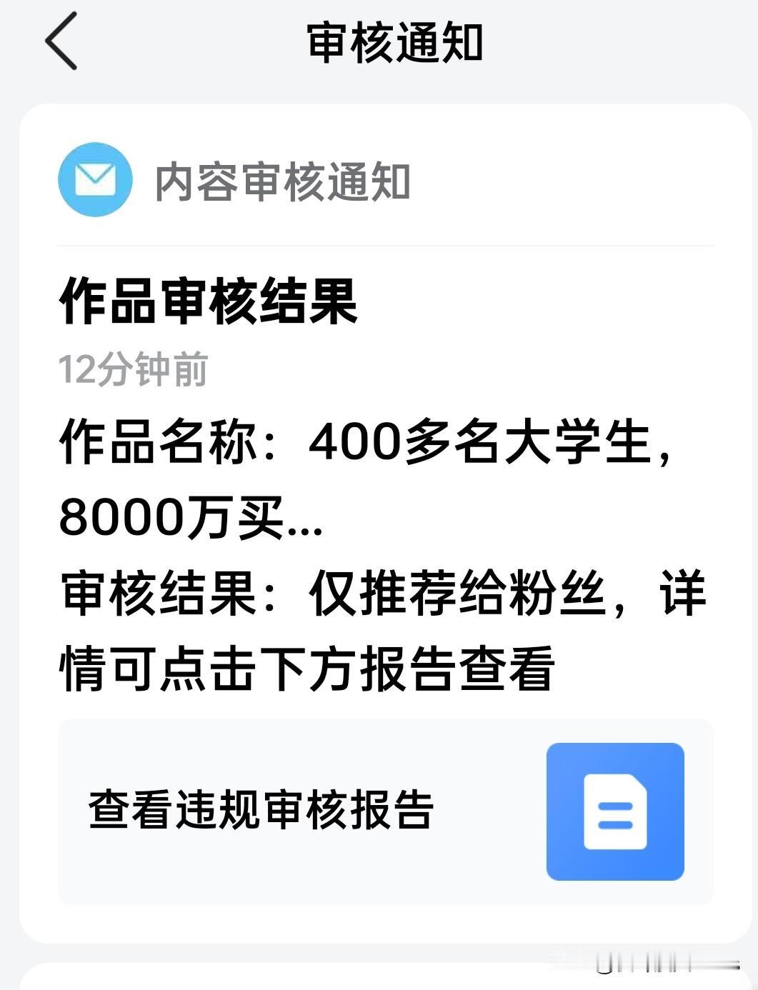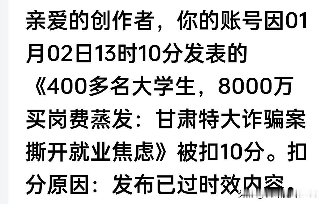 扣我10分,说我“过时”:一篇读后感的遭遇,戳破了内容审核的什么真相? 我昨天的一篇读后感作品,今天阅读量过万了,,却通知我被扣分了。 不是因为观点偏激,也不是因为内容违规。平台通知我:你发布了“过了时效”的内容,信用分扣10分。 我愣住了,重新读了好几遍我那篇文章。我写的是甘肃一起大学生求职诈骗案的感想——没错,案件新闻或许是“旧闻”,但我通篇写的,是对“唯学历论”和“铁饭碗”迷思的思考,是对教育投资的冷静提醒,是对多元化成才路径的呼吁。这些道理,今天不过时,明天也不会过时。 那一刻,我感到的不仅是委屈,更是一种深切的失望。如果连“读后感”这种承载个人思考的文体,都要被机械地套上“时效”的枷锁,那我们的平台,究竟在鼓励什么样的内容? 这不仅仅是一次误判。它像一面镜子,照出了一些令人担忧的现状:当审核只依赖关键词或简单的时间标签,而不愿去理解一篇文章真正的内核与体裁时,那些需要时间沉淀的思考、那些基于旧闻的新悟,都将失去容身之地。最终,平台上充斥的,可能永远是追逐最新热点的、浮于表面的“即时反应”,而深刻、冷静的回顾与反思将被驱逐。 一篇读后感的价值,恰恰在于它脱离了新闻的“瞬时性”,提供了沉淀后的观点。甘肃的案子会过去,但此案揭示的社会焦虑、教育困境与人性弱点,是跨越时间的真问题。我写下它,是希望有人能一起反思,而不是单纯“知道”。如果平台无法区分“新闻报道”和“观点论述”,那受损的不仅是创作者的热情,更是读者获取深度信息的环境。 我理解审核工作量大,算法辅助是现实。但“辅助”不应等同于“替代”。一个负责任的平台,应该在效率之上,保留一份对内容本质的基本尊重与辨别。误判难免,但是否建立了畅通的申诉与人工复核机制,让被误伤的思考有重见天日的机会?这考验着一个平台的诚意与格局。 我珍惜这个能够表达、能与千万人交流的平台。正因如此,我才更希望它能更好——好到能容纳下一篇也许不那么“即时”,却足够真诚的读后感。扣分事小,但因此让思考变得畏首畏尾,让表达只剩下对热点的趋同解读,那才是整个内容生态真正的损失。 我的申诉,不仅仅是为了要回那10分。更是想问一句:我们究竟想要留下什么样的内容,给这个时代? 写在最后的话: 刚刚,我的申诉审核结果下来了。审核还是没有通过,只推荐给粉丝,这种审核连新闻和读后感都分不清了吗?或者说想怎么审核就怎么审核,我的地盘我做主吗?感觉有点小小的失望! 友友们:在创作过程中,你们碰到过这种困惑吗?欢迎评论区留言、讨论、交流!评论区见! 爆料