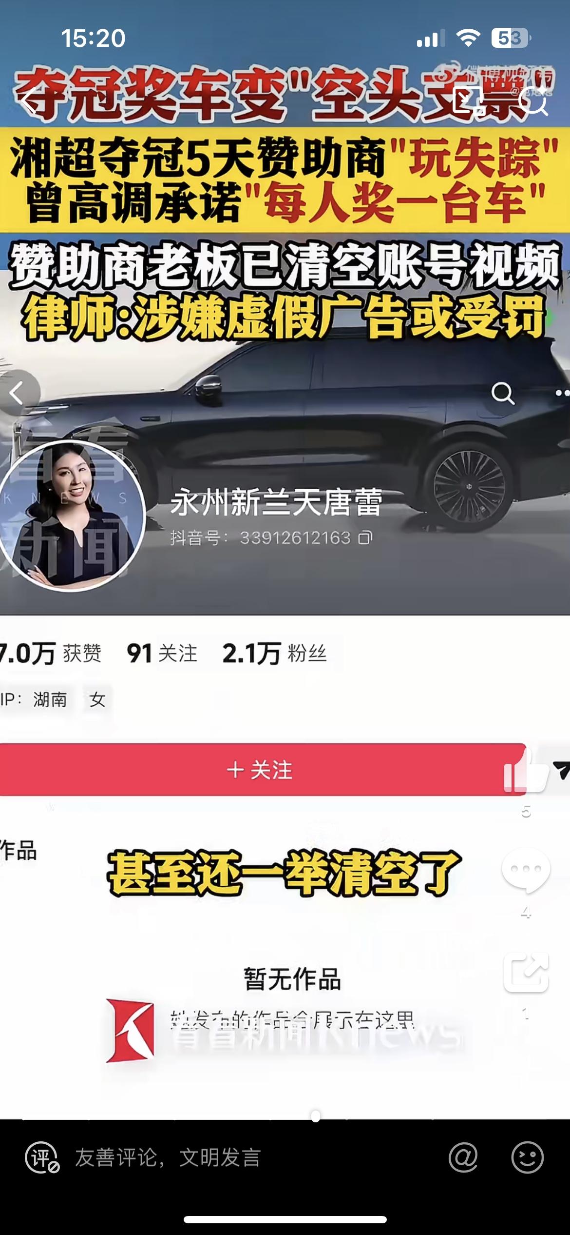 湖南永州新兰天集团唐蕾丢人丢大了,承诺给夺冠的湘超永州队每人奖励一台车,结果食言了。原本赞助了10万块给永州队,作为赞助商又激情承诺他们夺冠了奖车,估计是没算过账,几十个人几十台车需要多少钱。回去冷静一想,麻烦了,上千万的费用,怎么负担得起。现在只能装死充愣,糊弄过去了。永州队干长沙 永州队必赢