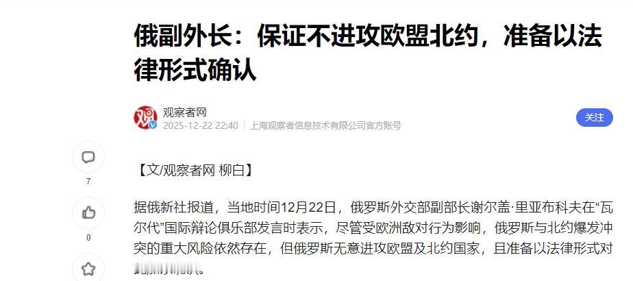 [太阳]俄罗斯走了一步让所有人都没想到的棋。它没有搞军事演习,也没放狠话,而是做了一件看起来最简单、最直接的事:它转过身,对北约和欧盟说:“我们签个‘互不侵犯条约’吧,白纸黑字,写清楚谁也别打谁,我甚至愿意给你法律保证”。 要理解这一提议的分量,得先看清北约近年来的发展逻辑,其长期推动成员国提升国防开支,目标是让各成员国国防开支达到国内生产总值的2%以上,部分东欧成员国甚至主动超额达标。 支撑这一要求的核心前提,是持续强调所谓东部安全威胁,将俄罗斯塑造为欧洲安全的主要挑战,在此背景下,北约不断推进东扩进程,吸纳多个原华约成员国加入,使联盟的军事部署持续向俄罗斯边境靠近。 俄罗斯此次提出的互不侵犯条约,明确要求以法律形式固定双方不使用武力的承诺,若能达成,将直接对北约现有安全叙事构成冲击。 从欧洲的实际情况来看,持续数年的冲突已经让不少欧盟国家承受了显著的经济压力,冲突爆发后,欧盟成员国的能源进口成本大幅上升,多个国家的通胀率曾一度突破两位数。 为缓解能源困境,部分欧盟国家不得不加大对可再生能源的投入,同时寻求多元化的能源供应渠道,这无疑增加了政府的财政负担。 除了能源问题,欧盟对乌克兰的各类援助也持续消耗着内部资源,欧盟委员会曾公布相关援助汇总报告,显示其对乌援助涵盖了军事、经济、人道主义等多个领域,累计金额相当可观。 这种持续的投入,已经让部分欧盟国家的民众和企业感到疲惫,一些国家的地方政府甚至公开表示,难以继续承担如此高昂的援助成本。 美国在欧洲能源市场的布局,也让欧盟的处境更加复杂,美国能源信息署的数据显示,冲突期间,美国对欧洲的液化天然气出口量大幅增加,出口额随之攀升。 有分析指出,美国液化天然气的价格远高于此前俄罗斯管道天然气的价格,这在一定程度上加重了欧洲企业和民众的能源支出负担。 与此同时,欧盟内部的分歧也在逐渐显现,在部分涉及对乌援助和能源政策的议题上,成员国之间的立场差异日益明显,一些国家开始更加强调自身的经济利益和民生需求,对联盟内部的统一行动提出了更多质疑。 俄罗斯提出的互不侵犯条约提议,恰好击中了当前欧洲安全格局的关键矛盾点,对北约和欧盟而言,接受这一提议意味着要重新审视自身的安全战略,调整长期以来的对俄定位,那些基于“东部威胁”叙事的军事部署和防务投入,其合理性都将受到质疑。 而拒绝这一提议,则需要向国际社会和本国民众解释为何放弃通过和平谈判解决安全争端的机会,这在舆论层面可能会陷入被动。 事实上,北约和欧盟的部分官员在回应这一提议时,态度显得较为谨慎,既没有明确拒绝,也没有表现出积极推进的意愿,只是强调需要对提议的细节进行深入评估。 国际社会对这一提议的反应也呈现出多元化的特点,联合国相关机构表示,支持一切有利于推动冲突和平解决的外交努力,希望各方能够保持沟通协商的态度。 一些中立国家则认为,俄罗斯的提议为打破当前的僵局提供了新的可能,呼吁北约和欧盟认真对待这一和平倡议,从俄罗斯的角度来看,这一提议并非单纯的外交姿态,而是基于自身安全诉求的合理表达。 俄罗斯此前多次通过官方渠道强调,北约东扩是影响欧洲安全的重要因素,希望西方能够重视俄罗斯的安全关切,通过平等对话构建平衡、有效、可持续的欧洲安全架构。 当前的欧洲安全局势依然复杂多变,各方的利益诉求和安全关切存在显著差异,要达成广泛认可的和平协议并非易事,俄罗斯的这一提议,为相关各方提供了一个重新审视彼此关系、调整安全策略的契机。 无论最终结果如何,这一举措都已经对当前的欧洲安全格局产生了影响,推动各方更加理性地看待冲突的解决路径,更加重视外交谈判在化解争端中的作用。 在全球安全形势日益复杂的背景下,通过对话协商解决分歧,构建均衡、有效、可持续的安全架构,已经成为国际社会的普遍期待。 信息源:《俄副外长:保证不进攻欧盟北约,准备以法律形式确认》观察者网