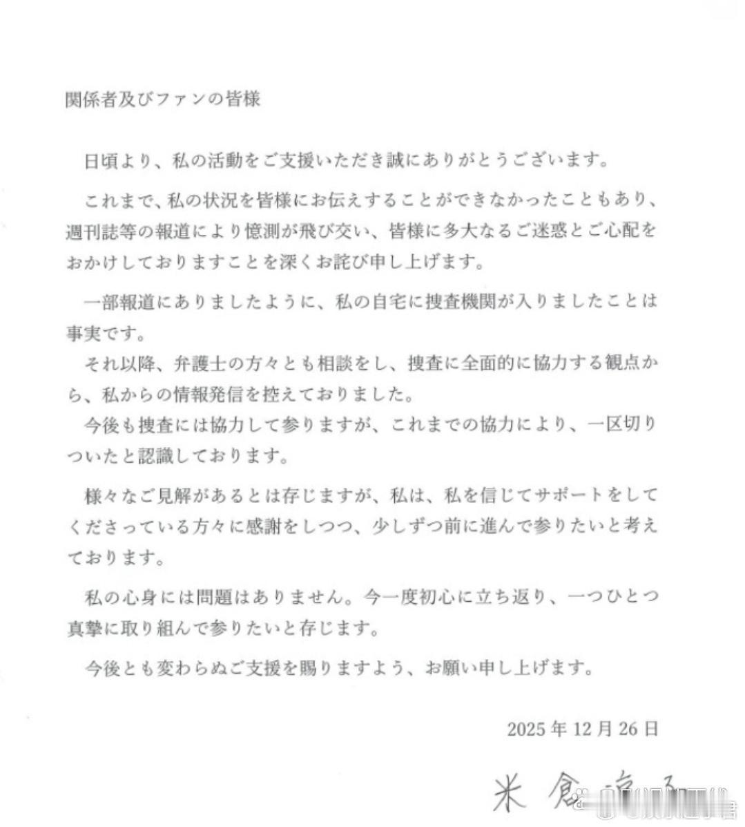 据日媒,米仓凉子首度回应去年10月《周刊文春》报道的住宅遭厚生劳动省麻药取缔部搜查一事。声明中,米仓承认“搜查机关入户搜查属实”,但未提及涉毒案件相关内容,关于沉默许久她表示是“与律师商议后,为全力配合搜查暂不发声。