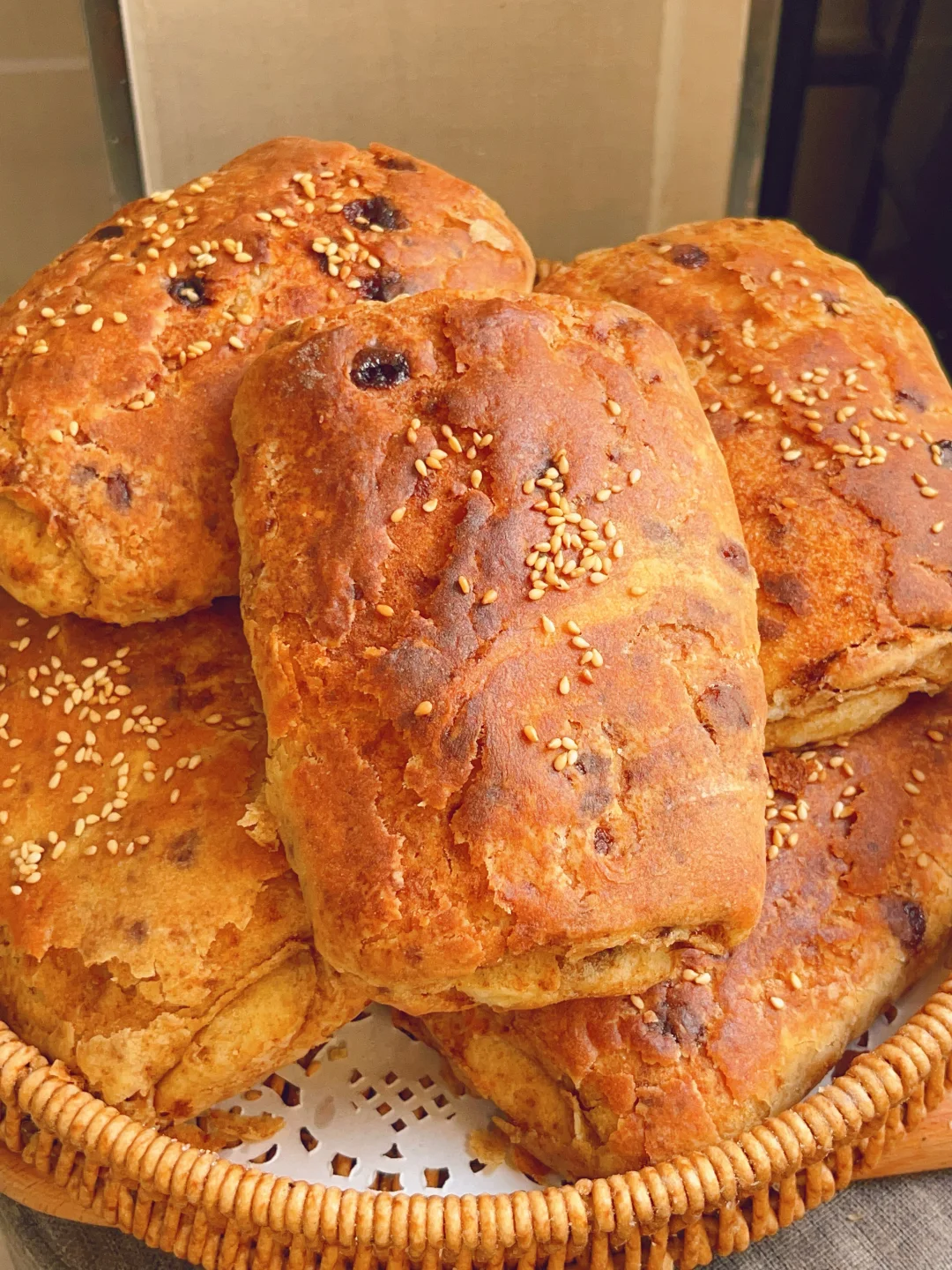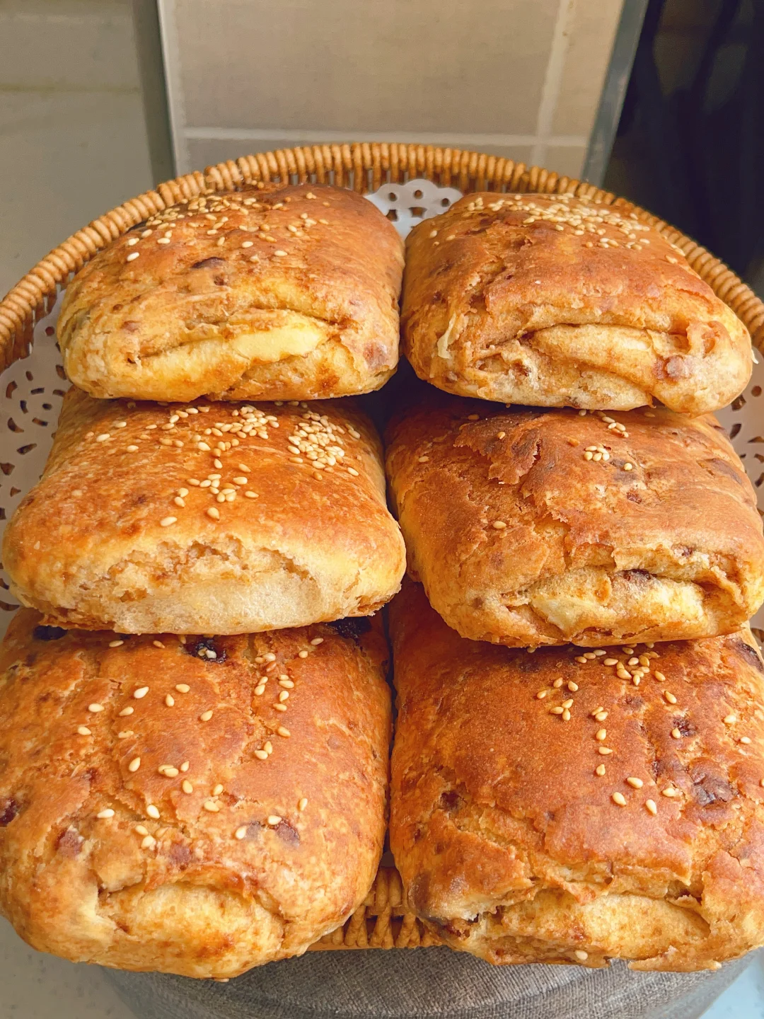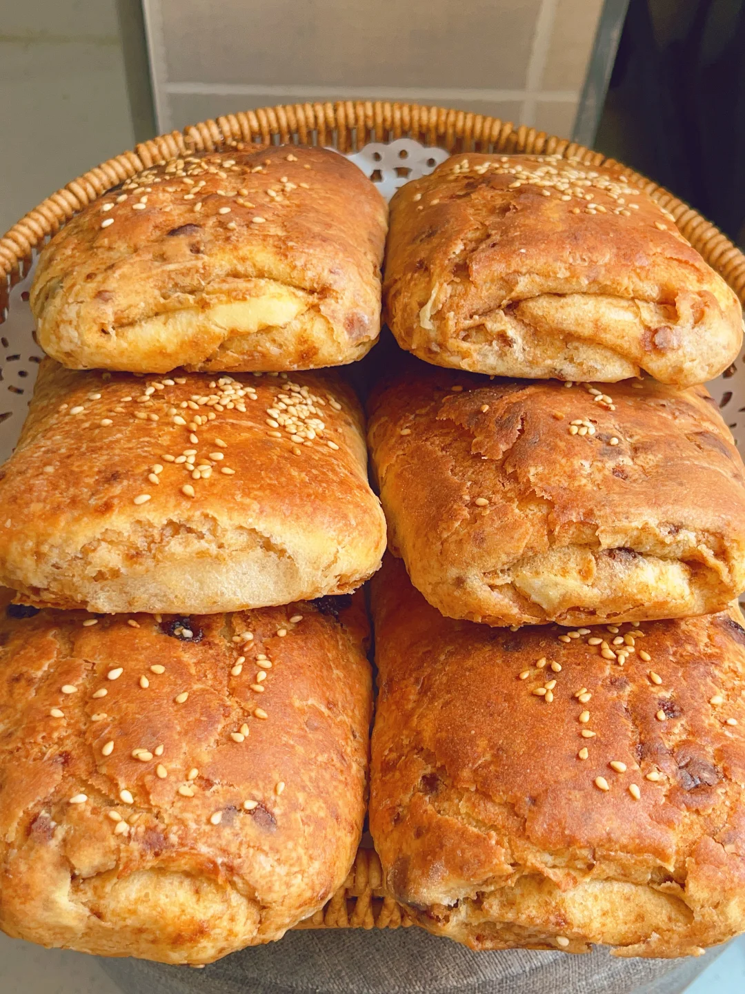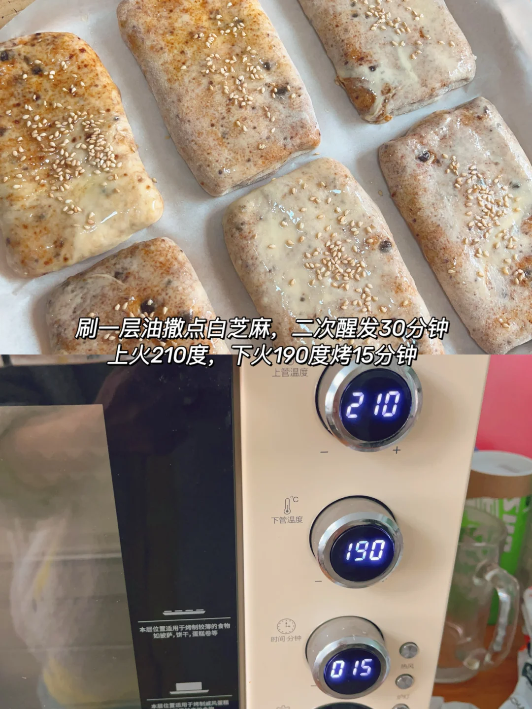 5⃣️擀好的饼子刷一层油撒点白芝麻二次醒发30分钟,烤箱上火210度下火190度烤15分钟