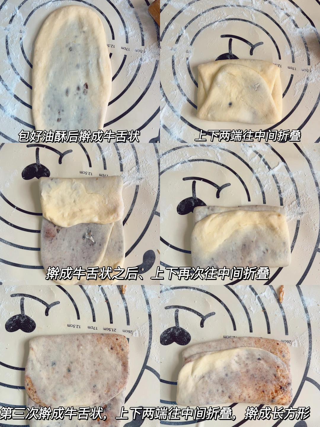 4⃣️面剂子压扁包上油酥,擀成牛舌状上下两端往中间折叠,再次擀长方形然后上下两端再次往里折叠,接着第三次擀成长方形,上下两端往中间折叠,最后稍微整理一下