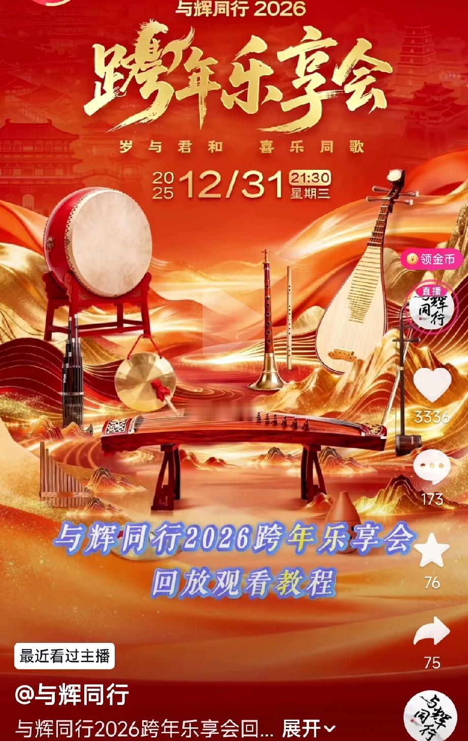 董宇辉太贴心了!刚刚与辉同行账号发布了“2026跨年乐享会回放观看教程”的视频。第一步,进入“与辉同行”抖音账号; 第二步,点击“节目”; 第三步,向下滑动找到“与辉同行2026跨年乐享会”直接点击视频就可以观看啦。 跨年夜因为有事没有观看的朋友,或是观看过了还想再看一遍的朋友,都可以去看完整的回放视频啦。 在了解了《白马颂》背后的故事后,更能感觉这个节目的震撼与深度,这下有空的时候就可以去欣赏回放啦。 董宇辉 与辉同行