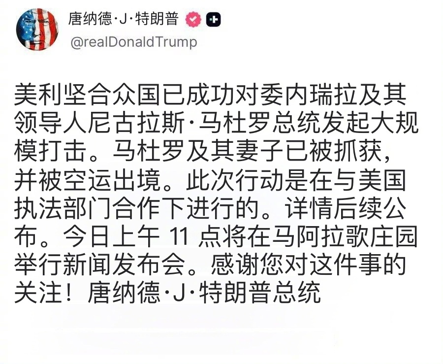 特朗普:已抓获委内瑞拉总统。特朗普发文称,美方已成功对委内瑞拉实施打击,抓获委内瑞拉总统马杜罗及其夫人,并带离委内瑞拉。特朗普称已抓获委内瑞拉总统