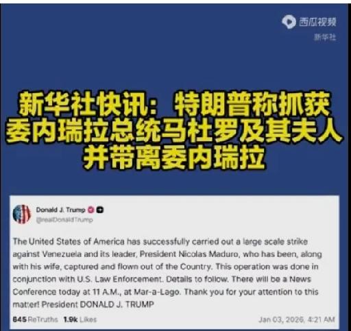 重磅消息!美国总统特朗普声称,美方已成功对委内瑞拉展开打击行动,擒获委内瑞拉总统马杜罗及其夫人,并将其带离委内瑞拉。 这无疑是美国明目张胆地入侵一个主权国家,并抓捕该国总统的恶劣行径。