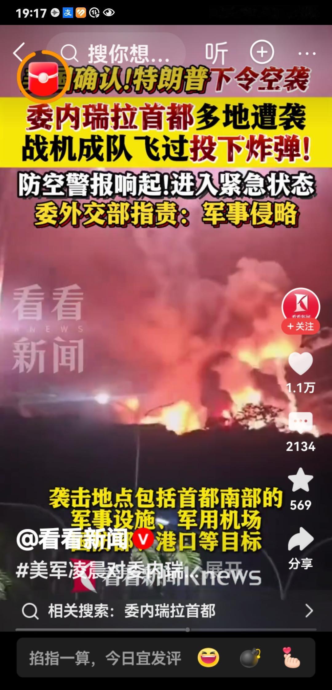委内瑞拉被空袭了,防空一点预警没有。之前在国内配合反毒,没用!之前意愿与美国求和,没用!特朗普要是你马杜罗下台,亲美上台归顺美国;特朗普要的是委内瑞拉的石油,以缓解国内经济、债务危机为他中期选举加分。