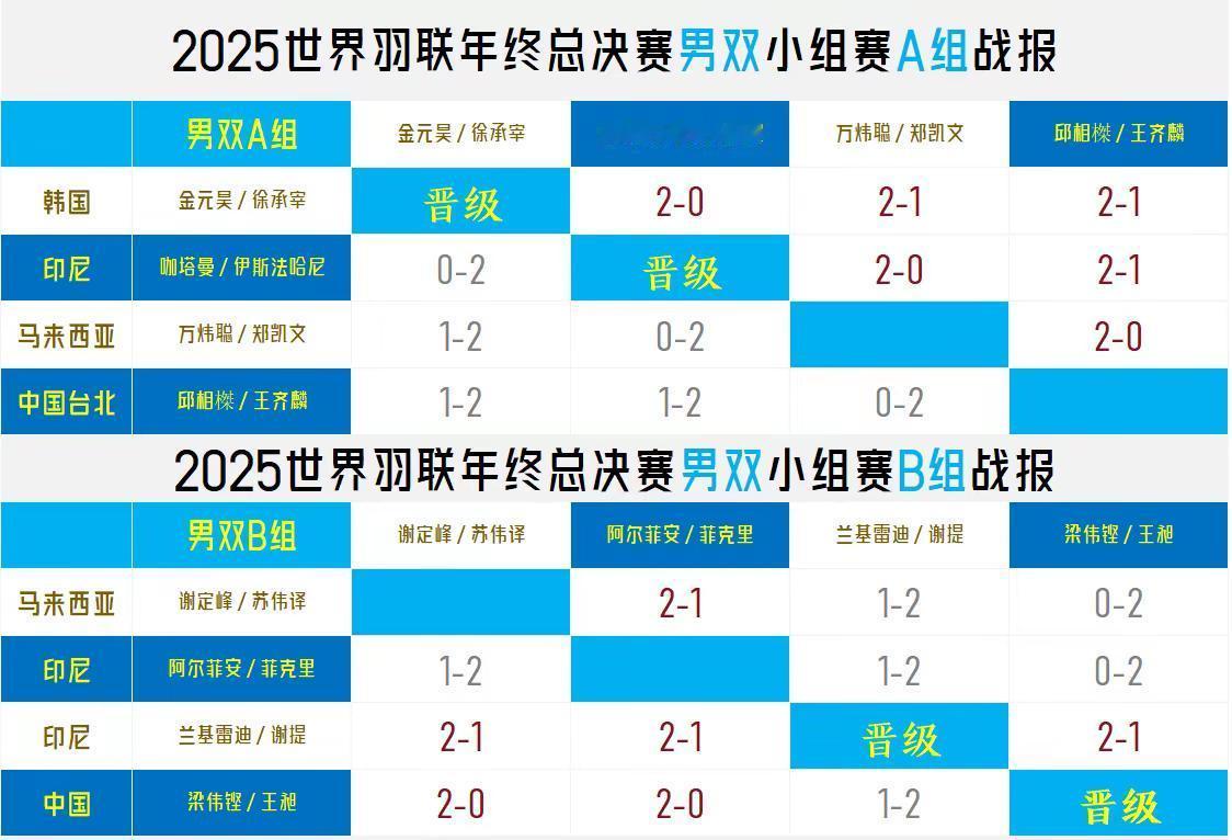【羽联年终总决赛男双小组赛收官!梁王组合首胜阿非组合携手兰谢组合晋级!】昨晚的男双对决焦点战,中国组合梁伟铿/王昶发挥出色,以21-17、21-14直落两局取得两胜一负的战绩,以B组第二晋级。A组韩国组合金元昊/徐承宰势头强劲,三连胜晋级;B组印度尼西亚组合兰基雷迪/谢提状态很好,希望梁王组合能杀进决赛。
