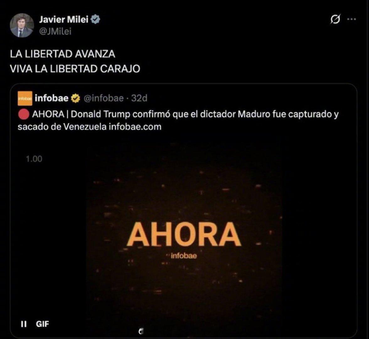 委美冲突阿根廷总统哈维尔·米莱(JavierMilei)发帖赞扬美国军方捕获马