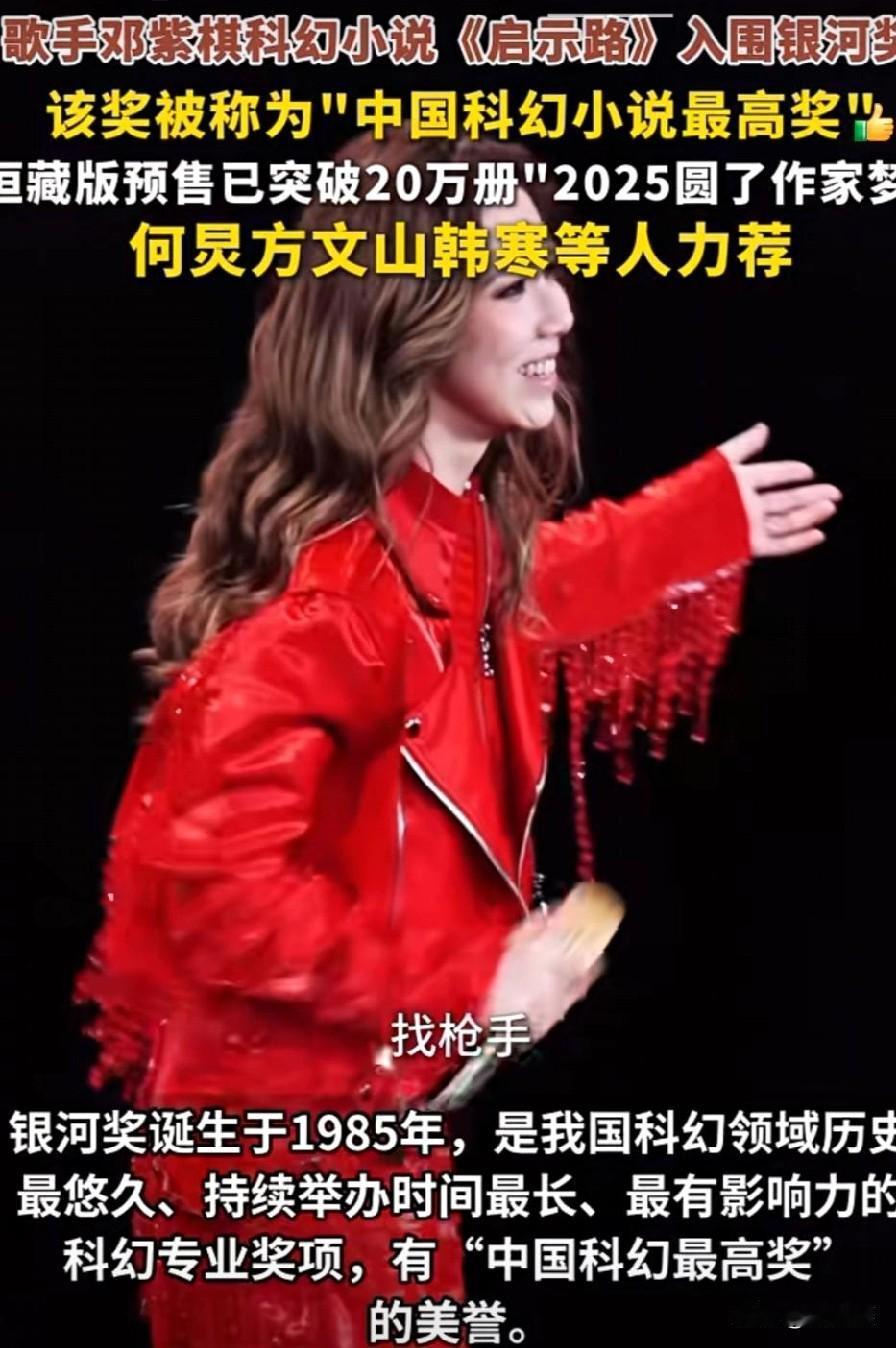 邓紫棋 太牛了 跨界玩出了新高度 她的长篇科幻小说《启示路》入围有“中国科幻最高奖”之称的银河奖最佳原创图书票选名单 这部作品的恒藏版预售还突破了20万册,何炅、方文山、韩寒等大咖都为其打call 邓紫棋坦言这部小说圆了自己童年的作家梦 还自信表示“找枪手也不可能比我写得好” 银河奖诞生于1985年,是国内科幻领域历史最久、最具影响力的专业奖项 能入围足以证明其创作实力 你会去读邓紫棋的这部科幻小说吗?