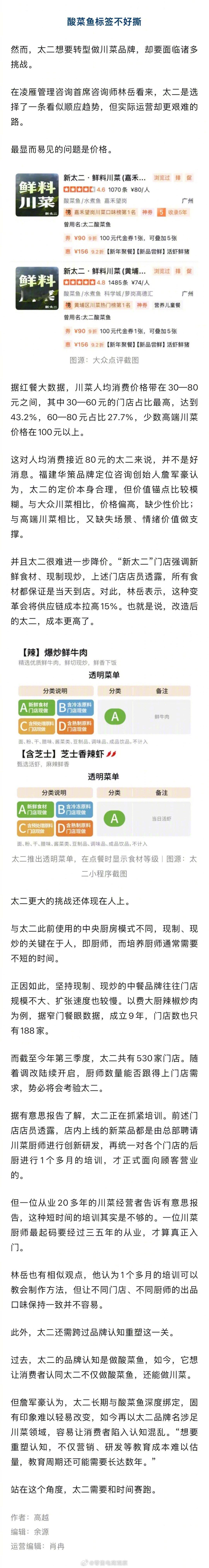 【太二卖不动酸菜鱼了】太二转型做川菜 2025年,如果你在年初、年中和年末去吃太二,或许会发现它的招牌在不断变化。先是部分门店加入“鲜活”二字,变成“太二鲜活酸菜鱼”;如今,又有门店将招牌改成了“新太二·鲜料川菜”。就连上菜时的口号都在不断更改,从曾经沿用多年的“酸菜比鱼好吃”,变成了“比酸菜更好吃的活鱼来了”,而当下的最新版本是“用鲜活食材,做鲜料川菜”。太二为什么放着酸菜鱼不做,跑去做川菜?一方面是太二难以靠酸菜鱼赚钱了。由于预制菜争议和平替酸菜鱼冲击,从2024年开始,太二业绩就陷入了疲态。财报显示,今年上半年,九毛九集团实现营收27.53亿元,同比下降10.14%;实现归母净利润6069万元,同比下降16.05%。其中,太二的收入为19.48亿元,同比下降13.3%。另一方面,整个川菜赛道却在蒸蒸日上。据红餐大数据,截至2024年10月,全国川菜门店数已超过15万家,占全国中式正餐赛道总门店数的11.4%,稳居各菜系之首。其实,酸菜鱼原本就是从川菜赛道中延伸出的一个爆品分支,如今,卖不动酸菜鱼的太二,想要回归川菜大本营了。此外,太二还想强调“鲜活”概念——食材新鲜、现做现炒。今年,经过预制菜风波后,消费者对现炒概念越来越关注,因此几乎所有餐饮品牌都在为自己贴上现炒标签,太二自然也不能落下。(有意思报告)