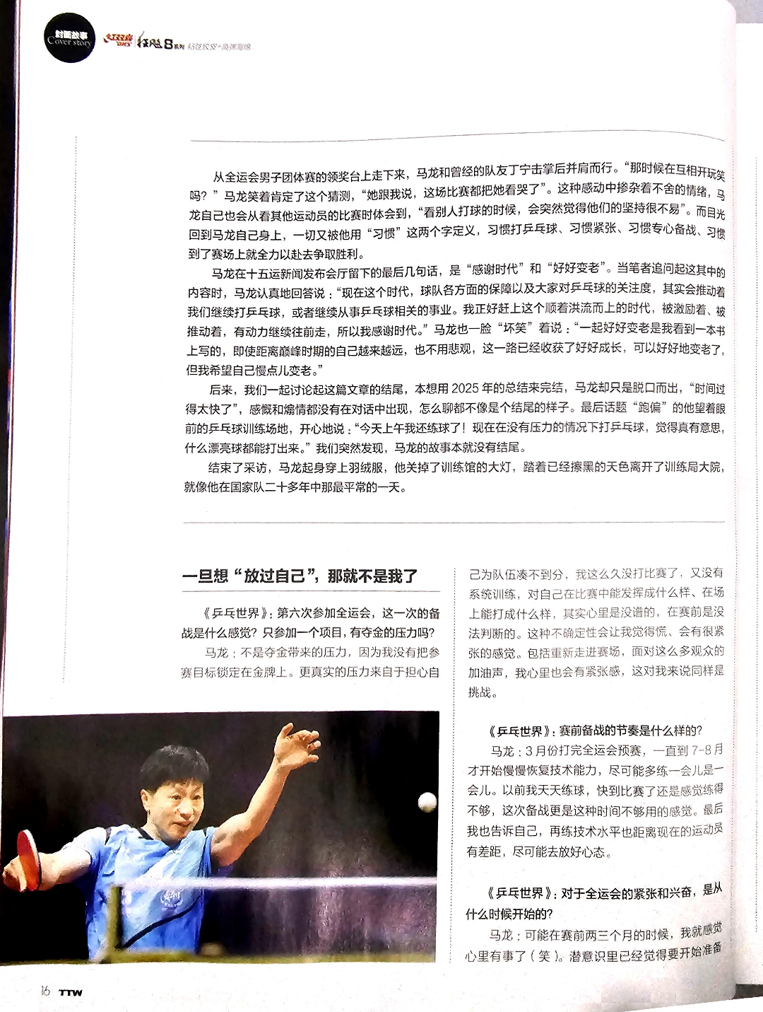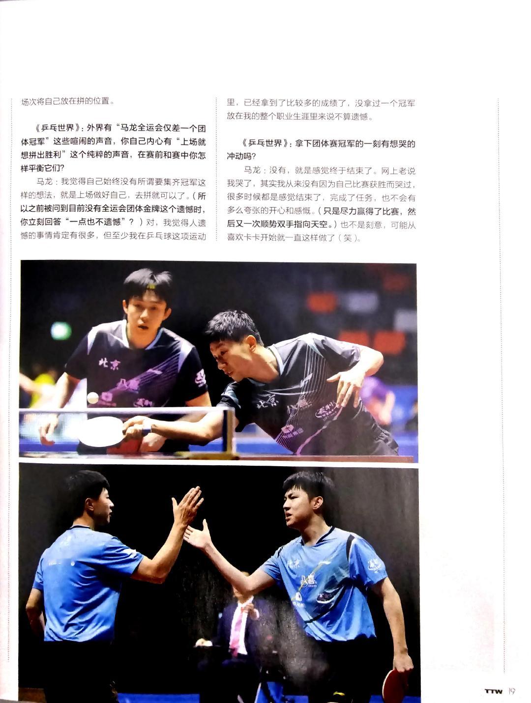 乒乓世界1月刊马龙 “采访时总是笑了又笑的马龙,在十五运赛场上下关于‘笑’的记忆只有一次,那次比赛全部结束后他问黄友政,‘你觉得我凶不凶’?然后听到黄友政小声回答‘挺凶’的时候。”–这次想过在比赛后要做点特别的动作吗?–“其实我想过,如果我是最后一场打完,想学参加了五届奥运会的古巴摔跤运动员(米贾恩·洛佩斯)那样,他高举战靴,我想的是把球拍和球鞋一起放下。”–当时没有做这些,但是回到宿舍和家里有没有什么仪式感?–“没有,回来以后就是早上送孩子去学校,然后去北京队活动活动,或者来训练馆练会儿身体。”–在赛后发布会你说的那句“希望我们一起好好长大,好好变老”又是怎样的概念?–“其实这是我那天看的一本书上写的,人变老是不可避免的。最近这一年中,我经常会刷到自己原来的比赛视频看,感慨我原来能打出这样的球!然后我会想以后也许我再也打不出这样漂亮的球,距离巅峰时候的自己越来越远了这时候可能会感觉伤感和失落。可就像书里说的那样,一直学习和成长,一路走来获得了好好成长以后,也可以好好的变老,不用悲观。变老很正常,但是我希望自己慢点儿变老(笑)。”“在工作上,我是个新手,是个小学生,尽自己最大的努力做就好; 但在赛场上,我对自己有要求,没做好会有遗憾,训练更是不会‘放过自己’。我想这是因为,工作不是我的全部,但是对于运动员马龙来说,比赛和成绩就是他的全部。”“最后话题‘跑偏’的他望着眼前的乒乓球训练场地,开心的说:‘今天上午我还练球了!现在在没有压力的情况下打乒乓球,觉得真有意思,什么漂亮球都能打得出来。’我们突然发现,马龙的故事本就没有结尾。”