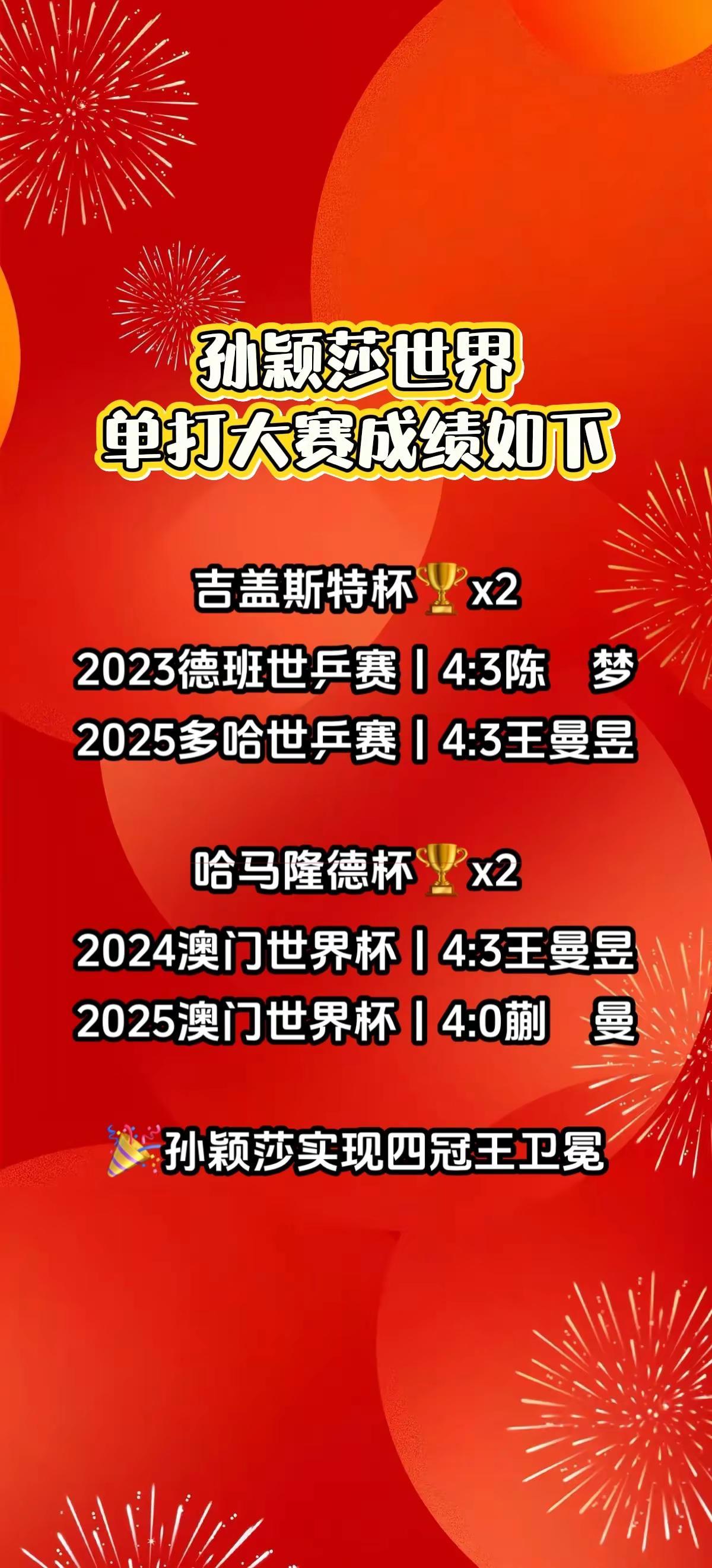 孙颖莎世界单打大赛成绩如下。热门