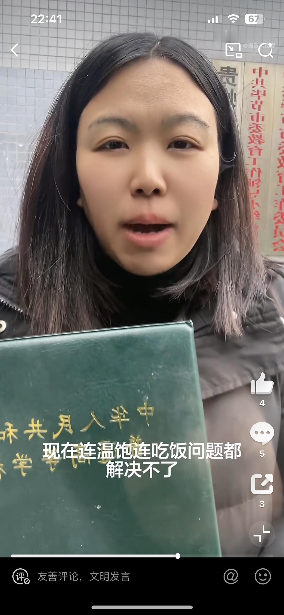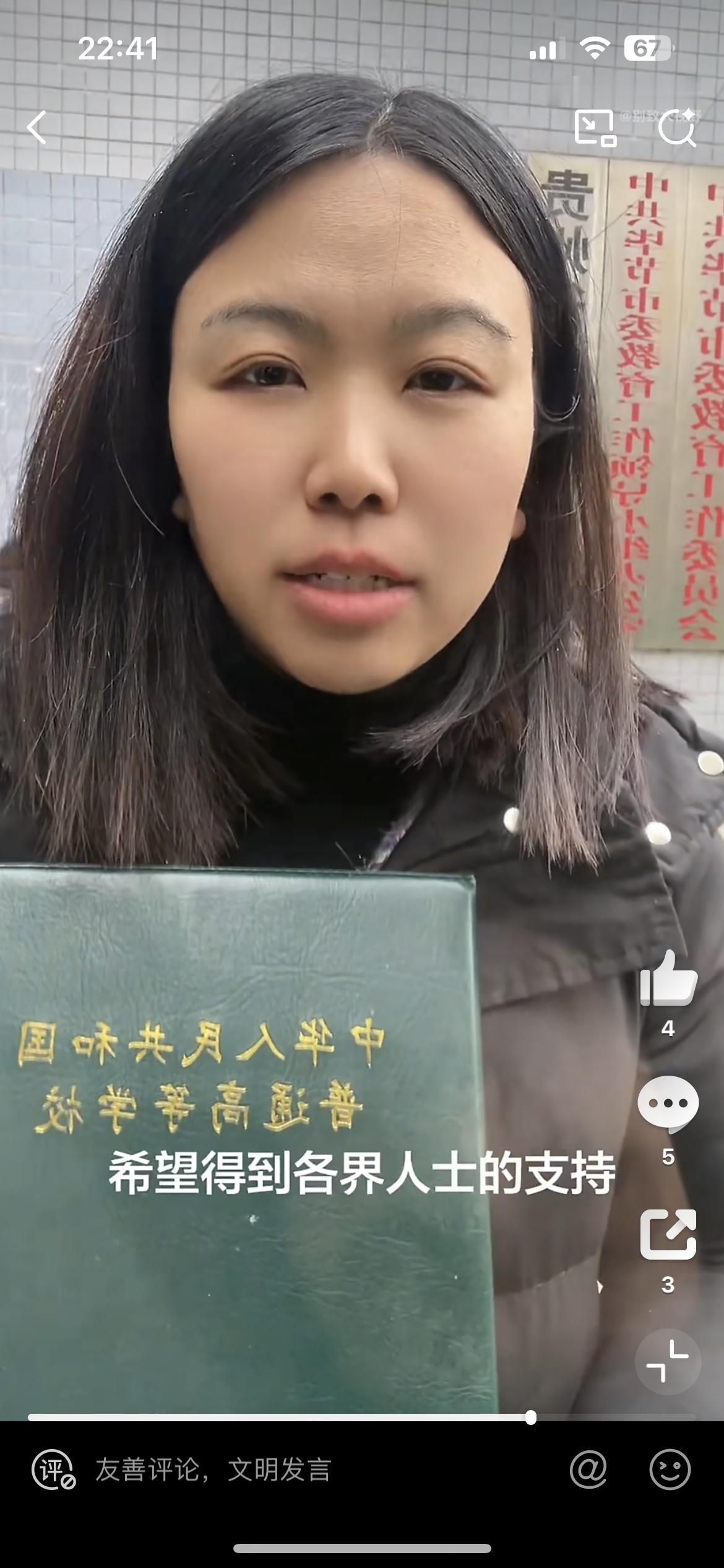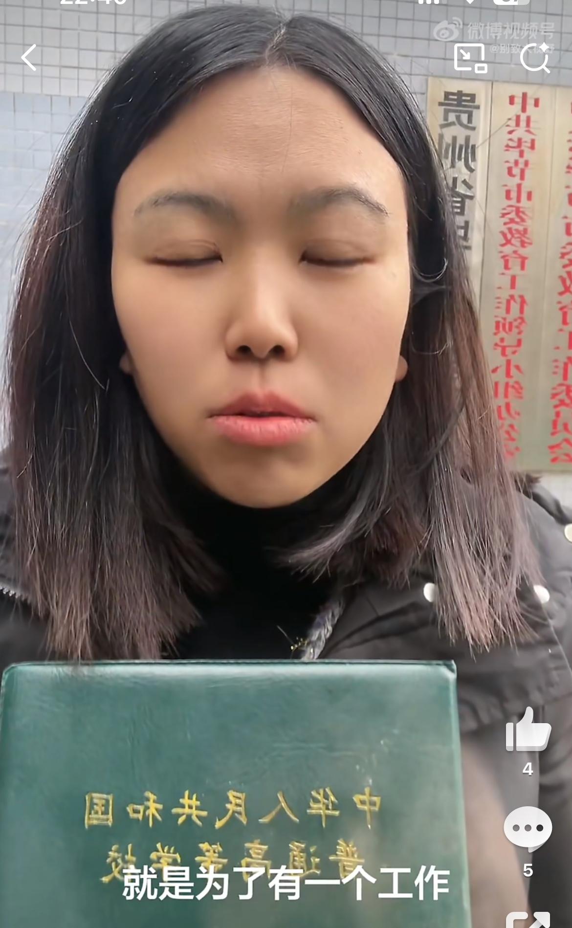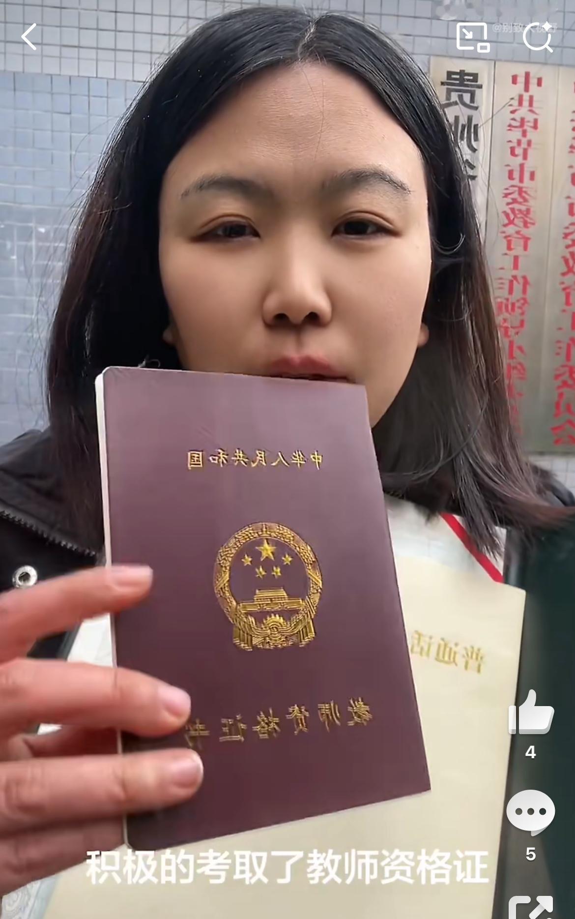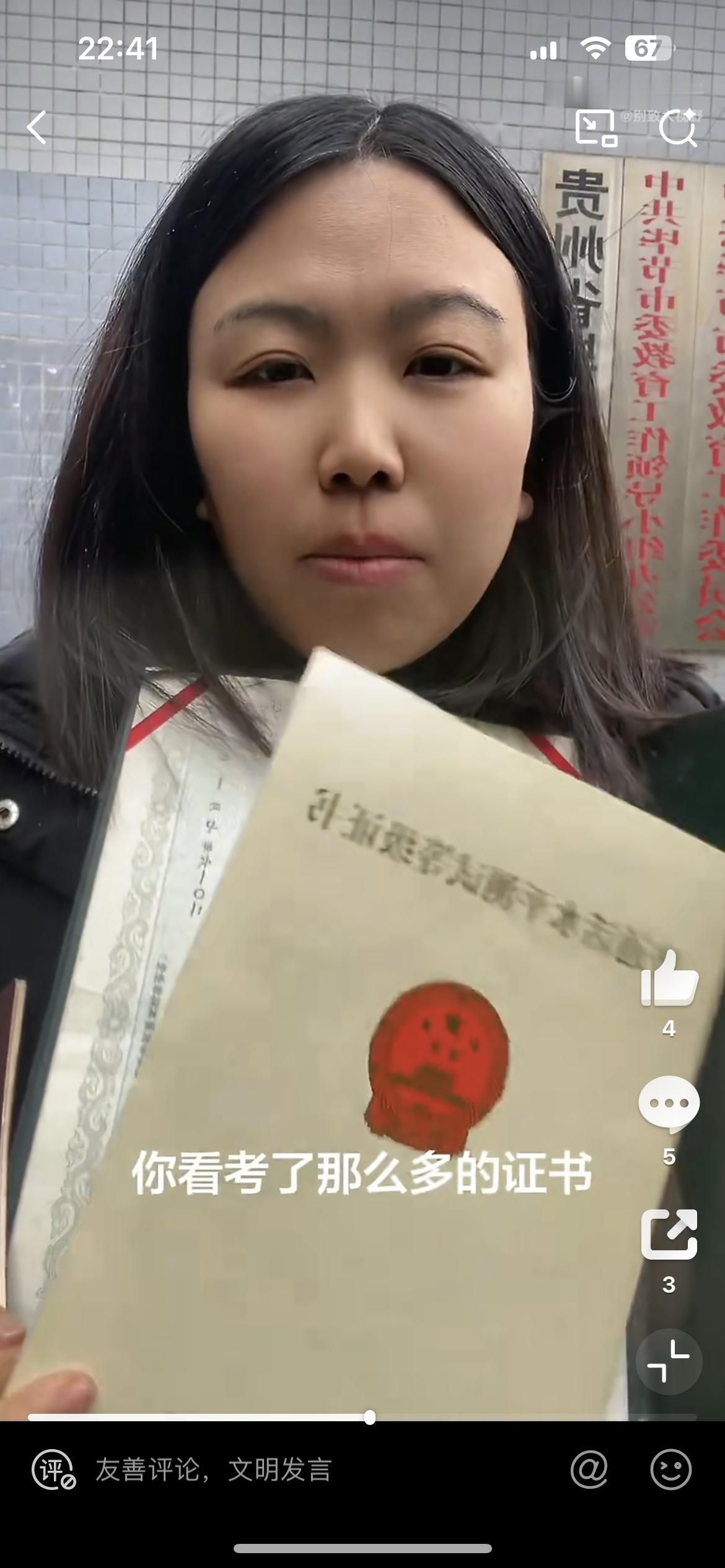 37岁女子考了一堆证书没有工作,到教育部门讨说法,希望广大网友支持她,这不是荒唐吗?女子自称四川警察学院毕业10年,没有找到工作,后面又考了教师资格证,还是没有工作,就觉得很委屈,这些证考了有什么用,现在吃了上顿没下顿,没工作没房子没家庭,感觉人生很失败,想去给她发这些证的部门讨要说法,难不成他们还能给你安排工作。自己不行,就不要怪天怪地了,巨婴。无业考公女