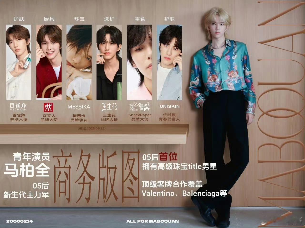 马柏全 马柏全的时尚表现力同样一骑绝尘;他不仅空降巴黎时装周成为华伦天奴秀场唯一中国男星代表,更手握Messika和Prada两大高奢助阵的《Another Man》双封面,这种顶级资源配置是很多人难以企及的
