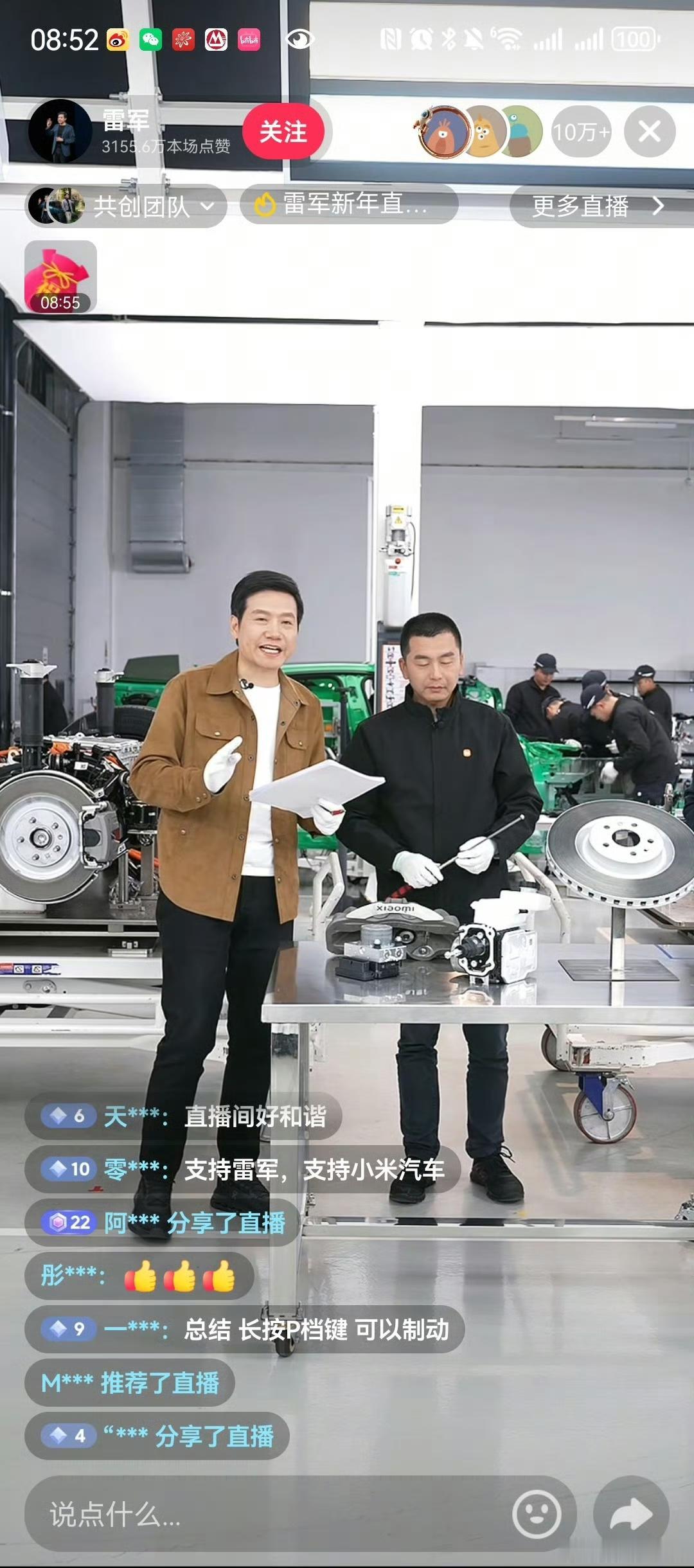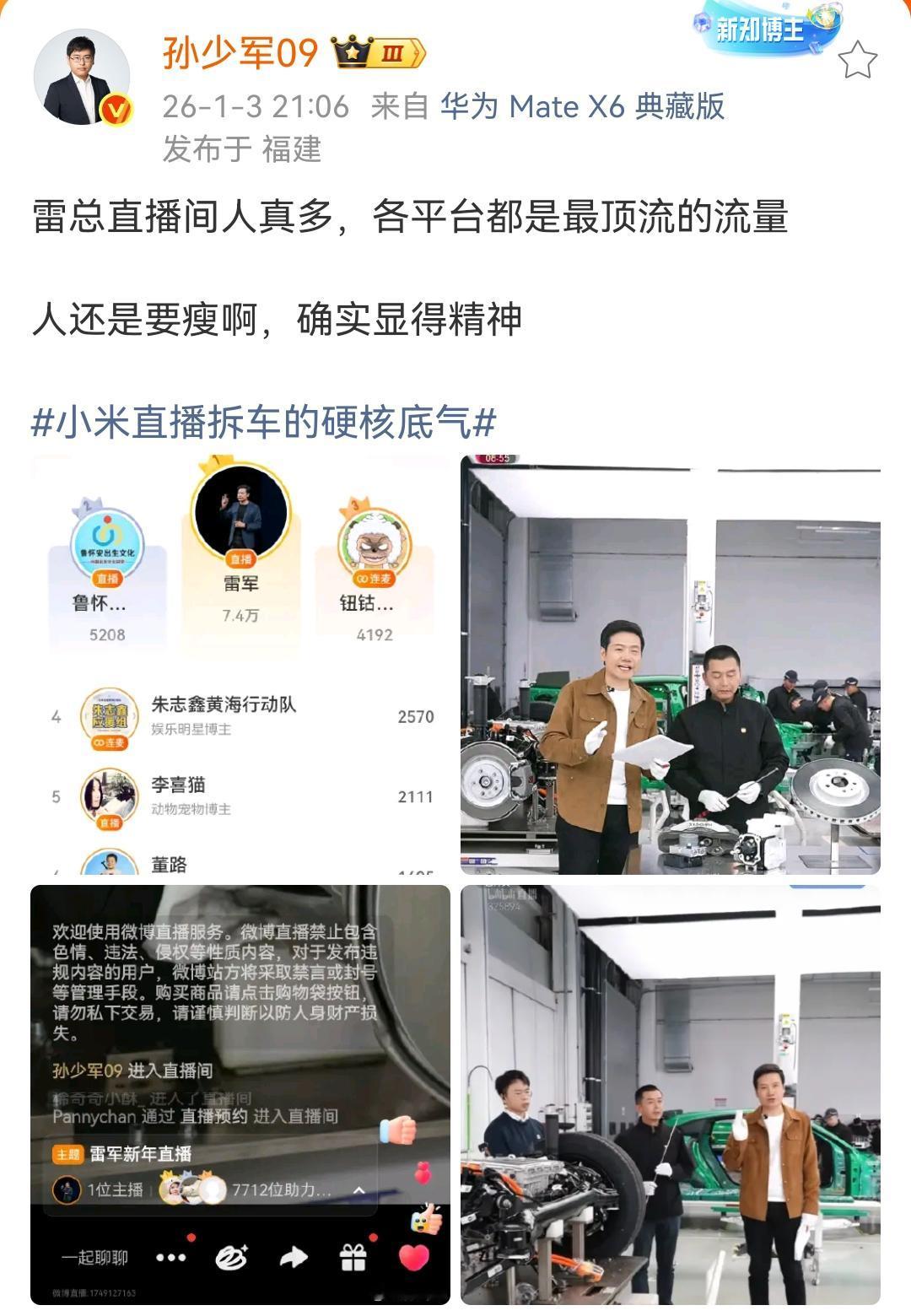 孙少军:雷总直播间人真多,各平台都是最顶流的流量! 人还是要瘦啊,确实显得精神。一个好的直播效果,需要多方面的能力,雷军在今天的直播效果就非常的强。 大家对于拆车这件事情的关注度本身就比较大,更何况这是雷军进行的直播开车。当时小米方面已与各平台有比较深厚的合作,在各平台也更加容易看到雷军的相关直播画面。 这一次小米YU7拆解打消了大家对小米安全性的部分疑问,必将为接下来的持续热销提供支持。结合小米YU7近期推出的三年零利息,预计小米YU7的订单会持续增长。 各位是怎么看的?欢迎评论区留言。