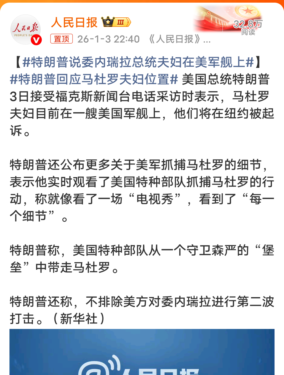 最新消息:特朗公布马杜罗夫妇在美国军舰之上!根据新华社援引:美国总统特朗普3日接受福克斯新闻台电话采访时表示,马杜罗夫妇目前在一艘美国军舰上,他们将在纽约被起诉。特朗普说委内瑞拉总统夫妇在美军舰上特朗普回应马杜罗夫妇位置