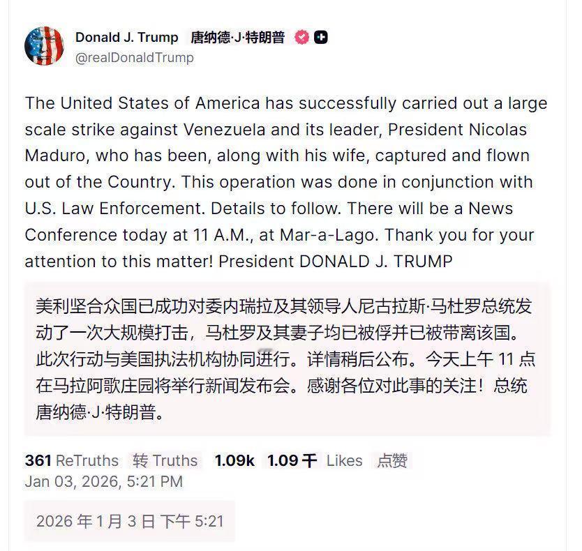特朗普称已抓获委内瑞拉总统这操作真是干净利落啊