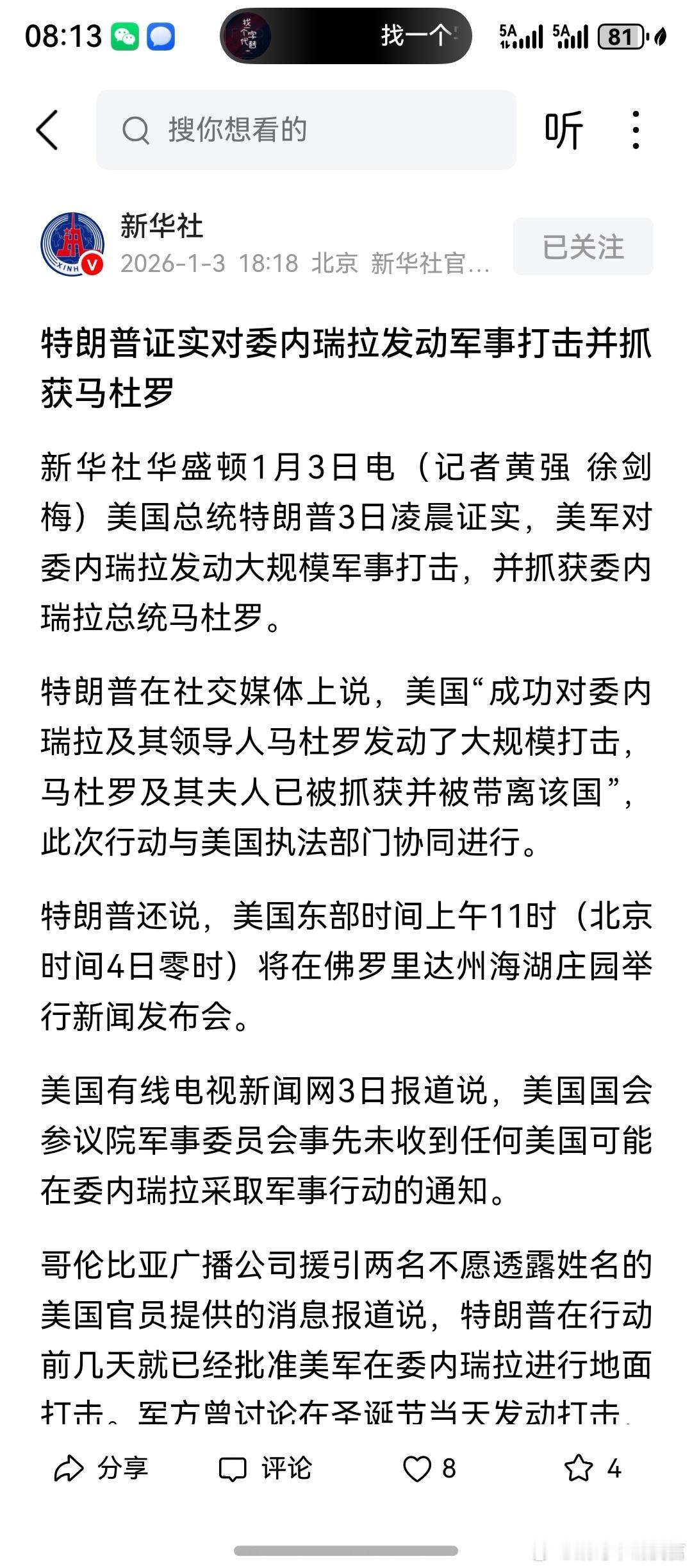 说干就干,利索。马杜罗系被美军三角洲特种部队抓获